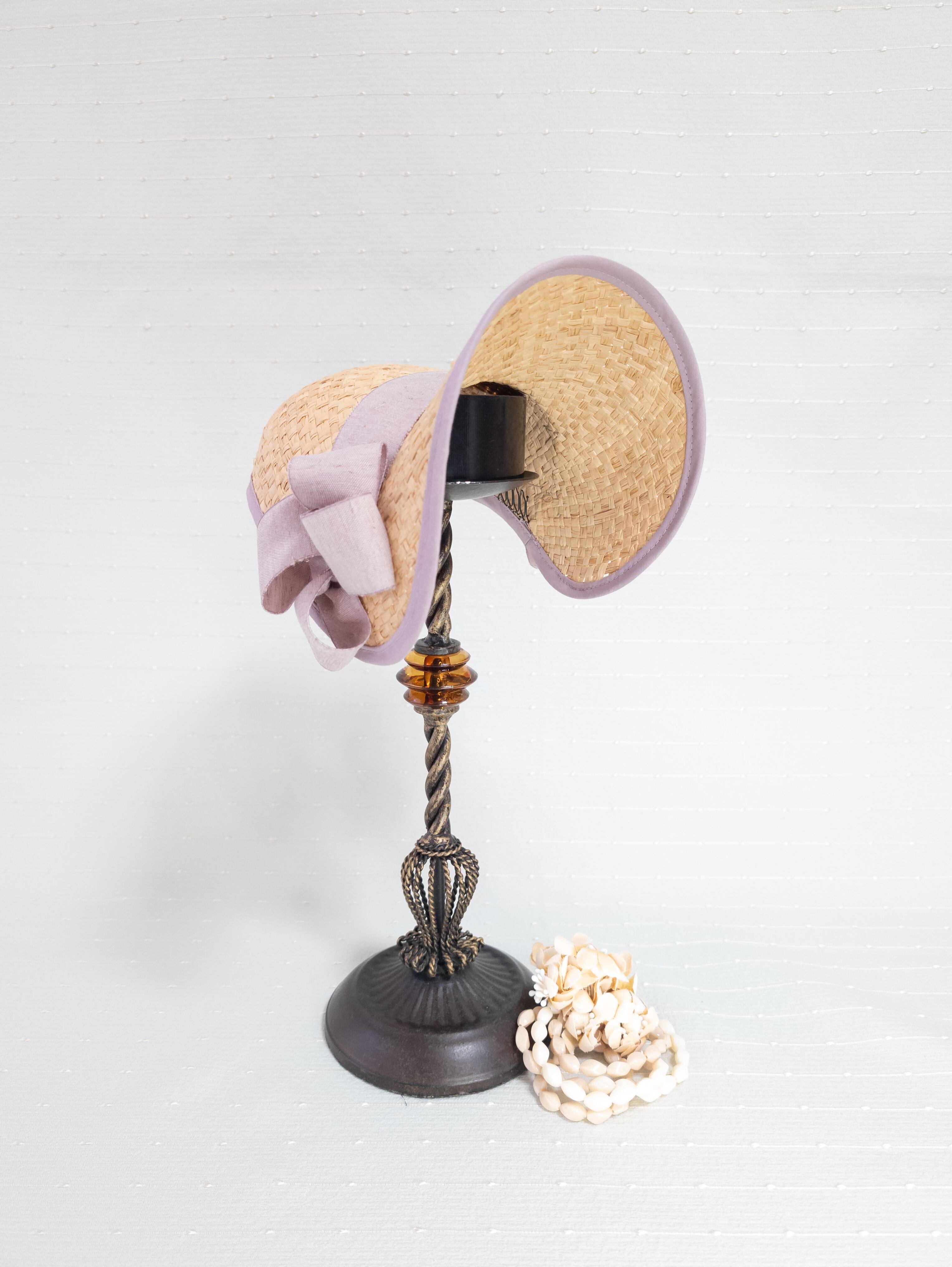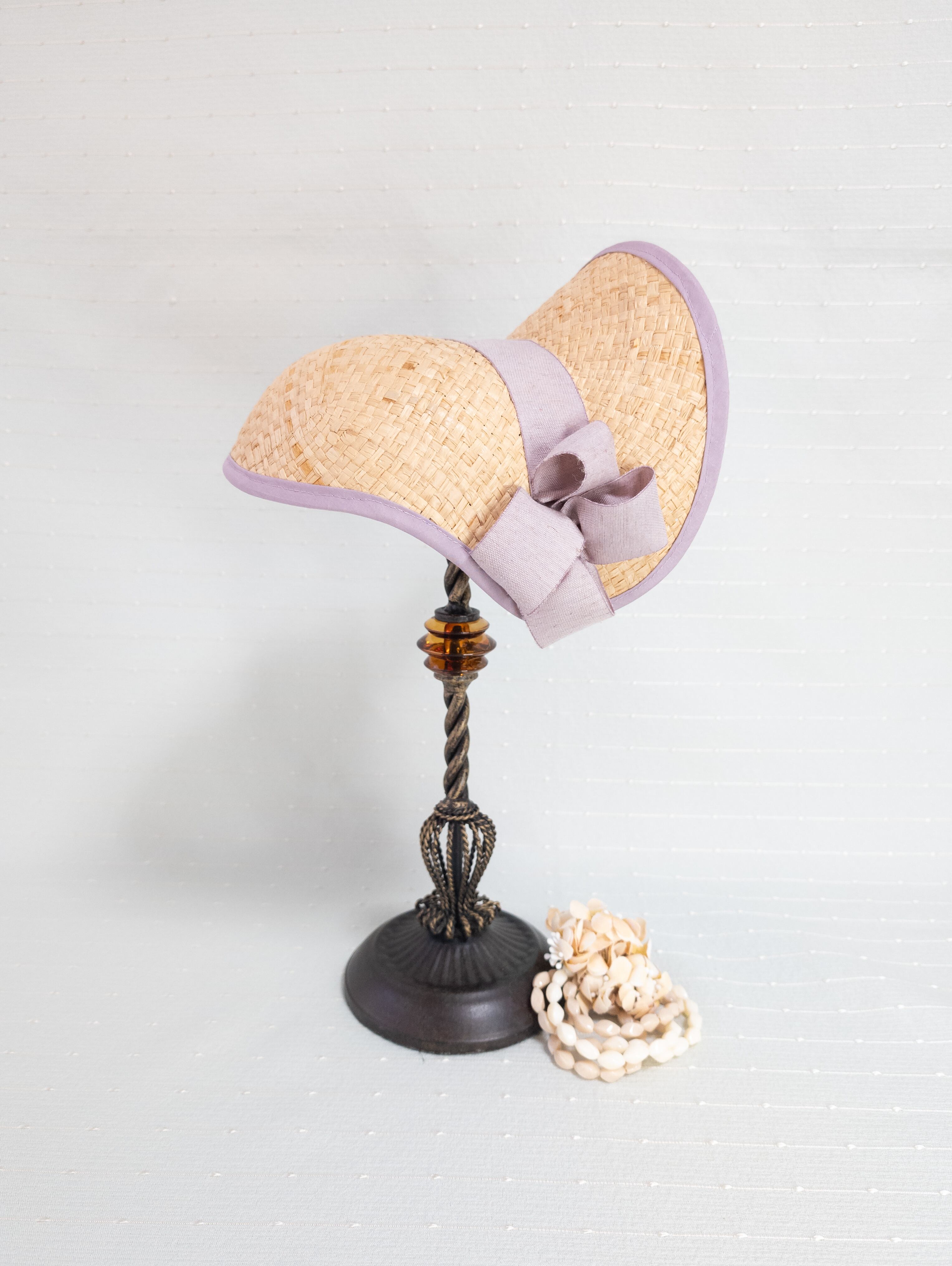 ナチュラルカラーの天然草素材を型入れして作ったストローカチューシャ、ハーフハットタイプです。薄いピンクのパイピングとリボン、水色のビオラの花を飾りました。ブリムがやや大きめでインパクトのあるロマンチックスタイルをお楽しみ頂けます。