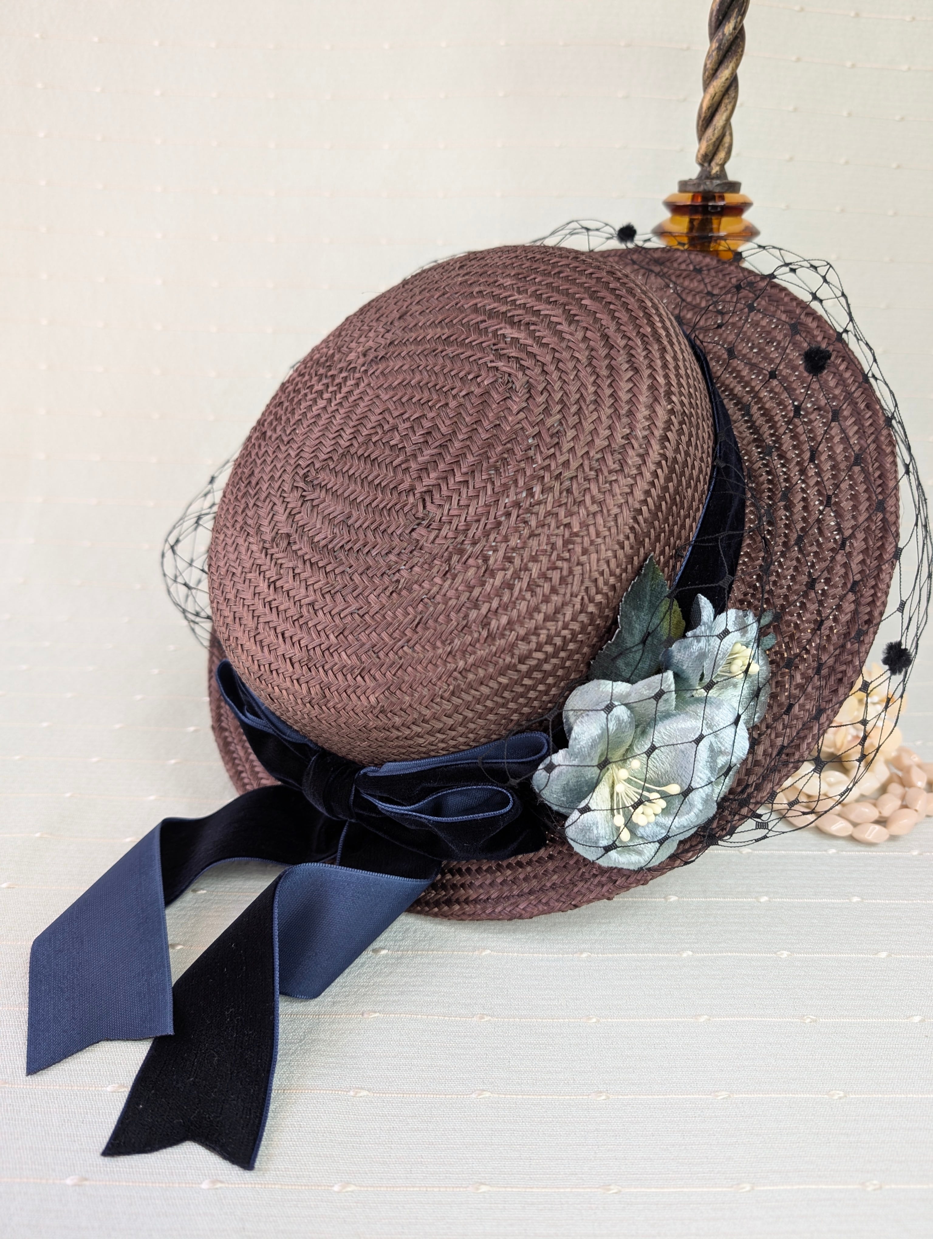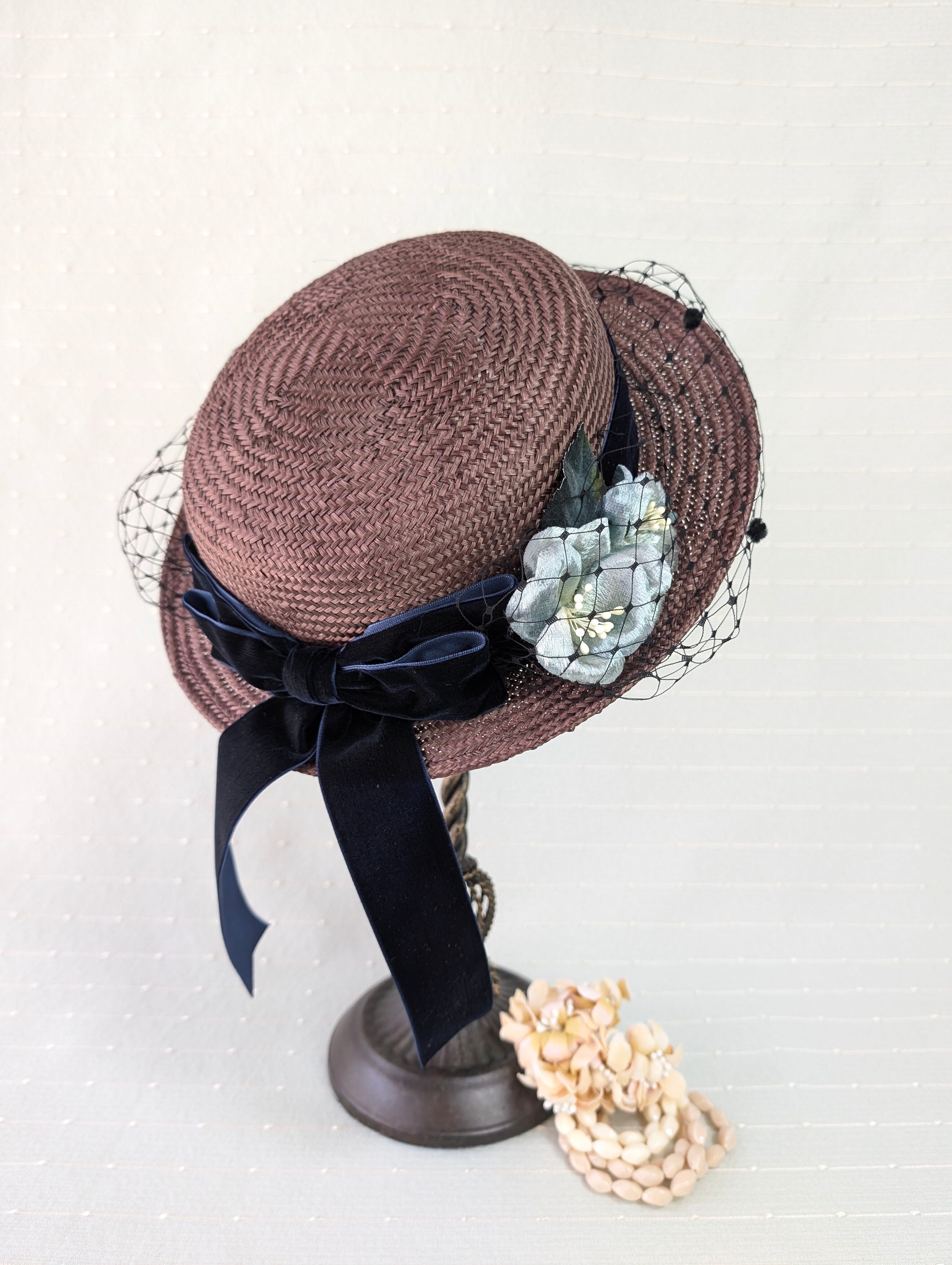 ダークブラウンの天然草素材を型入れして作ったスタンダードなボーターハットです。ネイビーのベルベットリボンにヴェール、青い薔薇のブーケを飾りました。やや低めのクラウンと水平ブリムがクラシカルな印象のかぶりやすい帽子です。