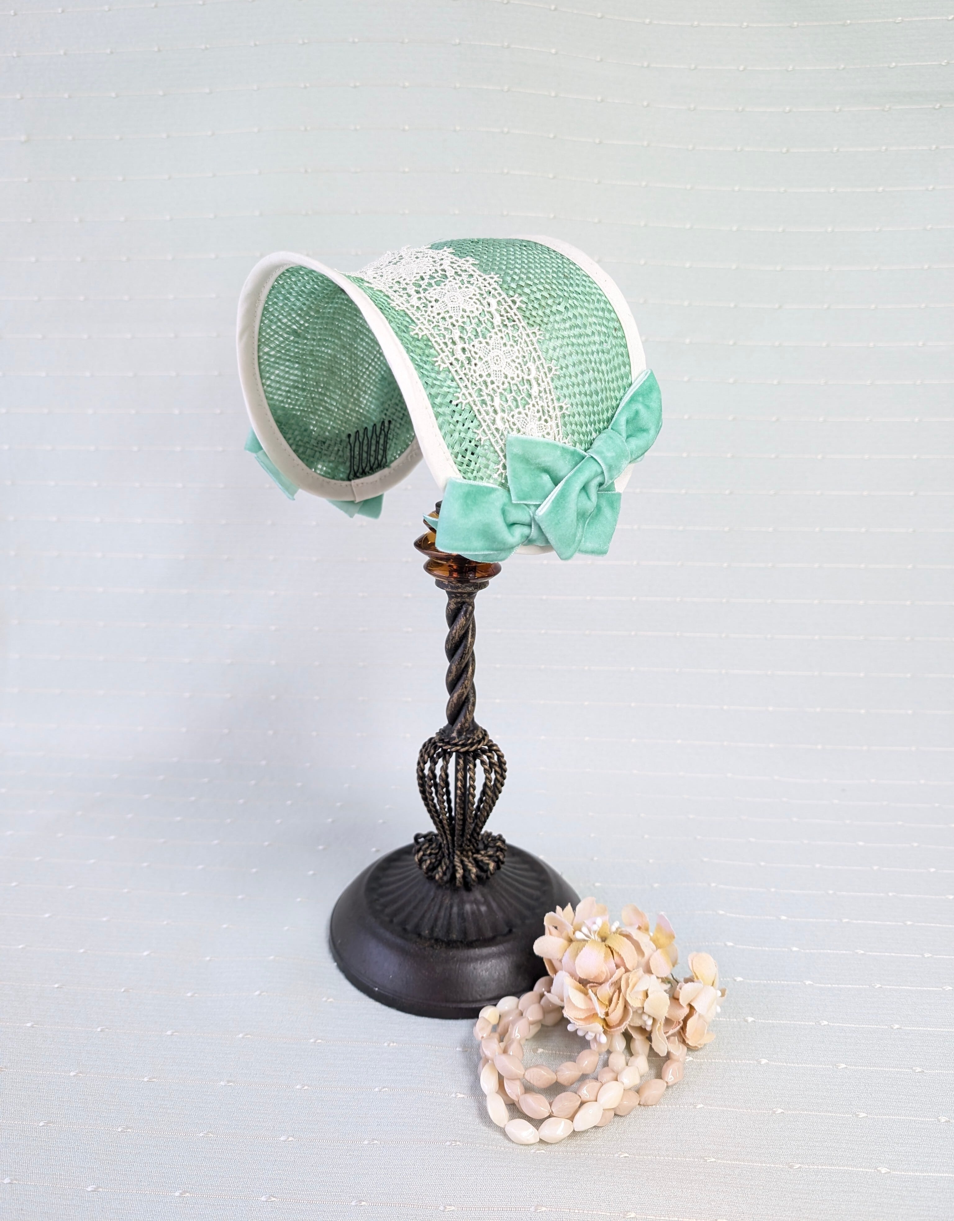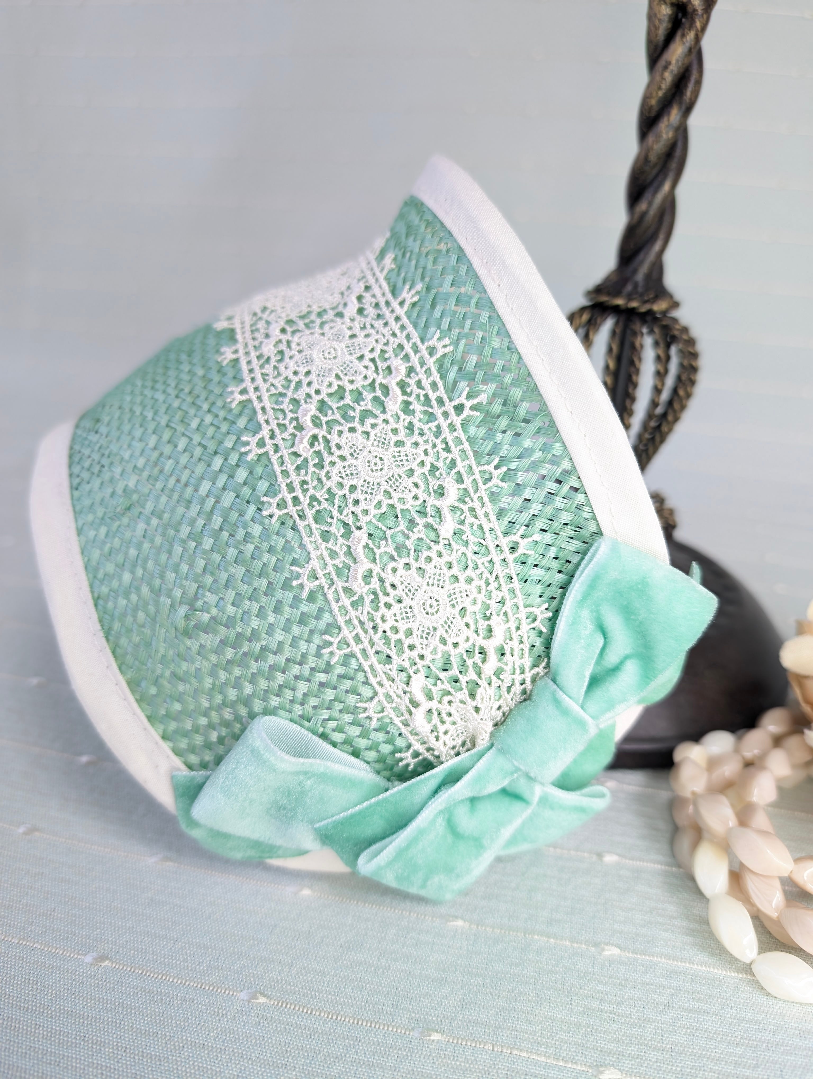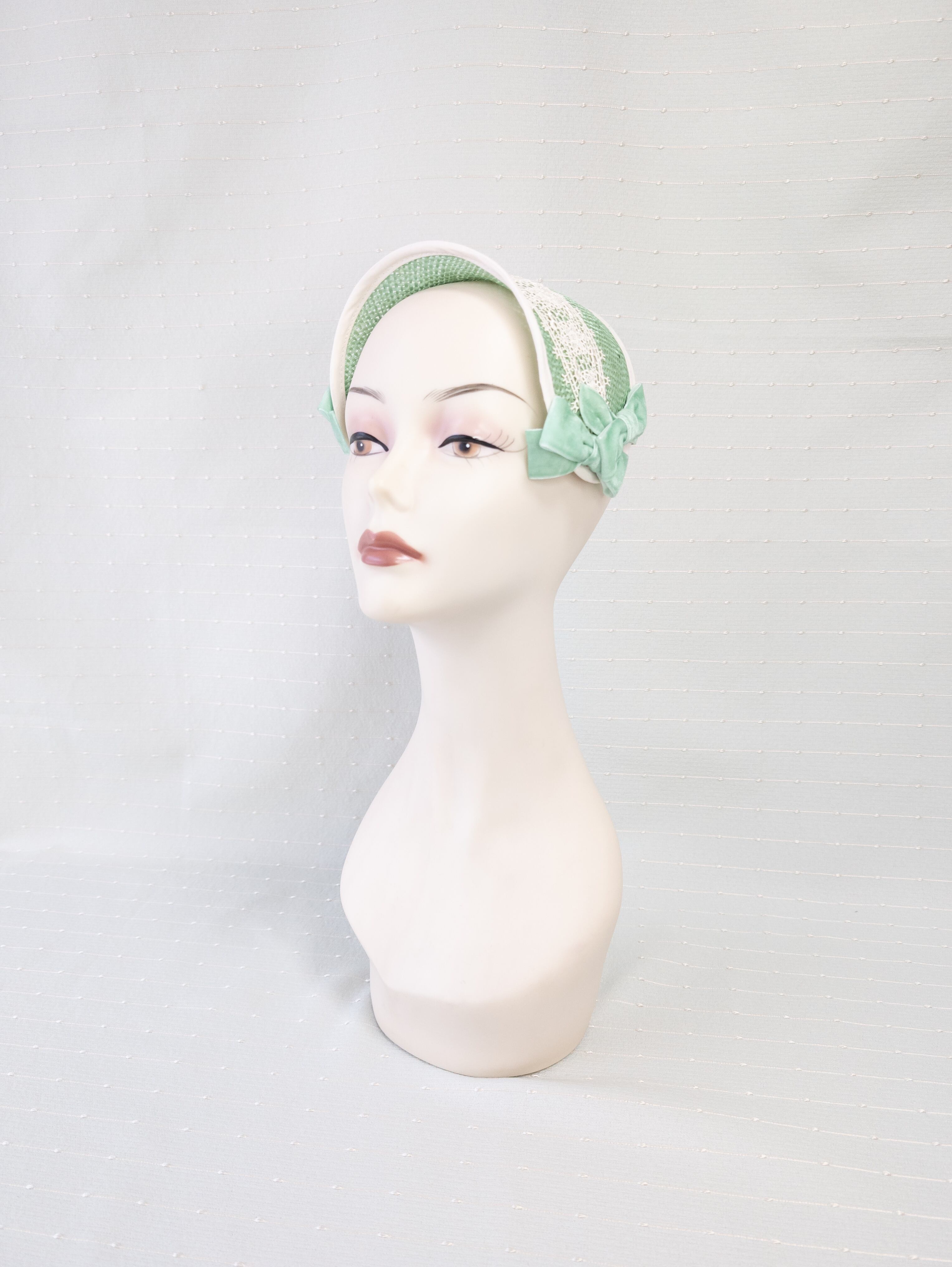 アップルグリーンの天然草素材を型入れして作ったストローカチューシャです。同系色のベルベットリボンとアイボリーのレースを飾っています。フロントが少しだけ持ち上がったデザインです。洋装だけでなく、お着物や浴衣にも合わせ安いのではないかと思います。