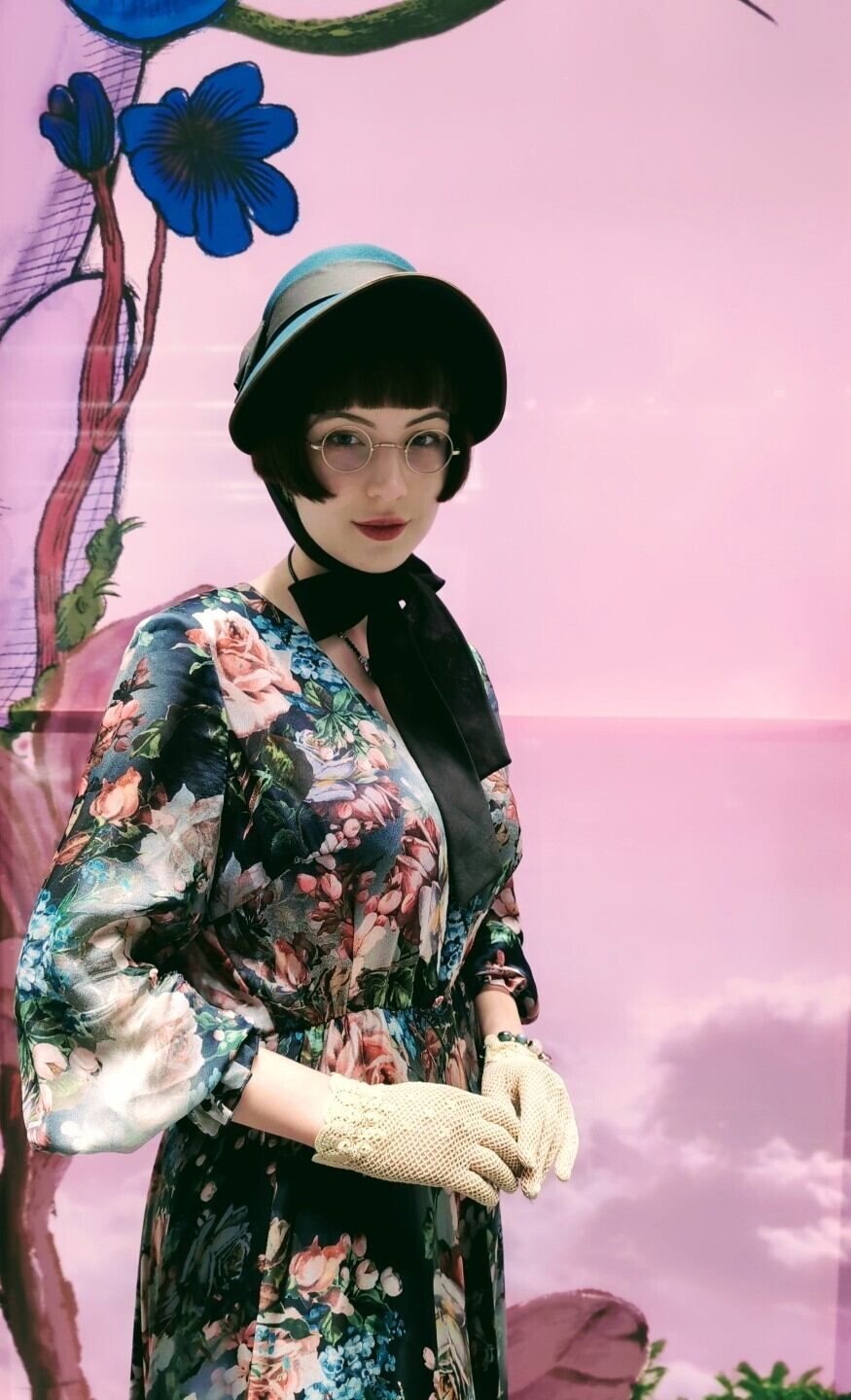クラシカルなボンネット型の帽子です。ベルベットリボンにスミレの花束を飾りました。