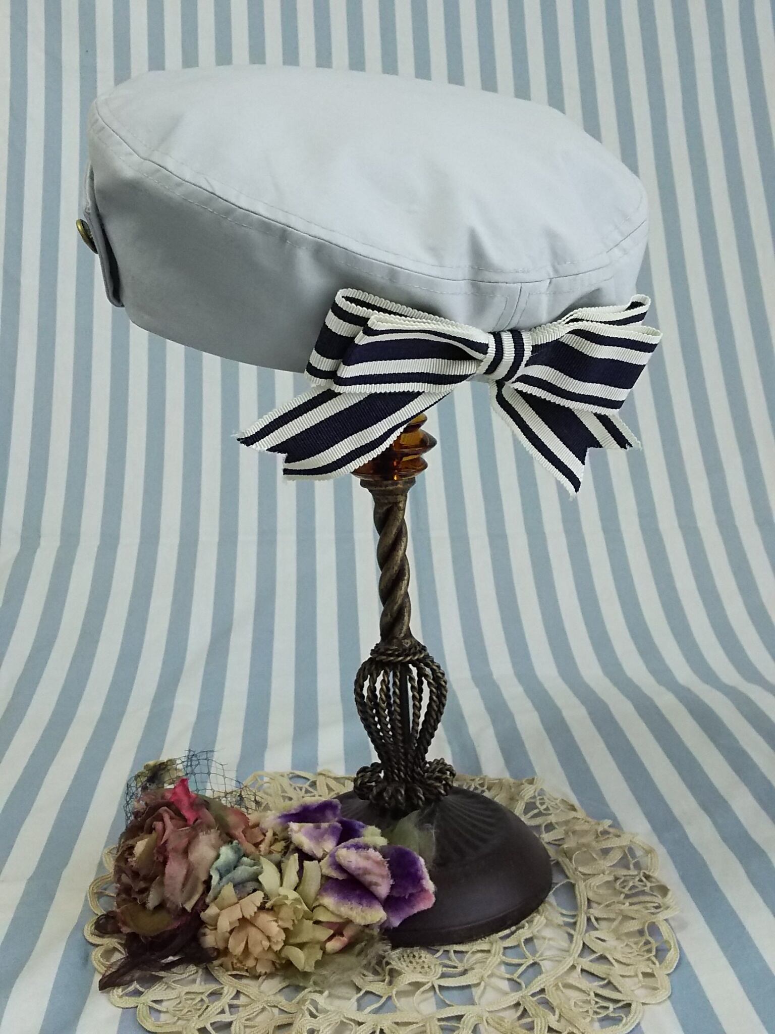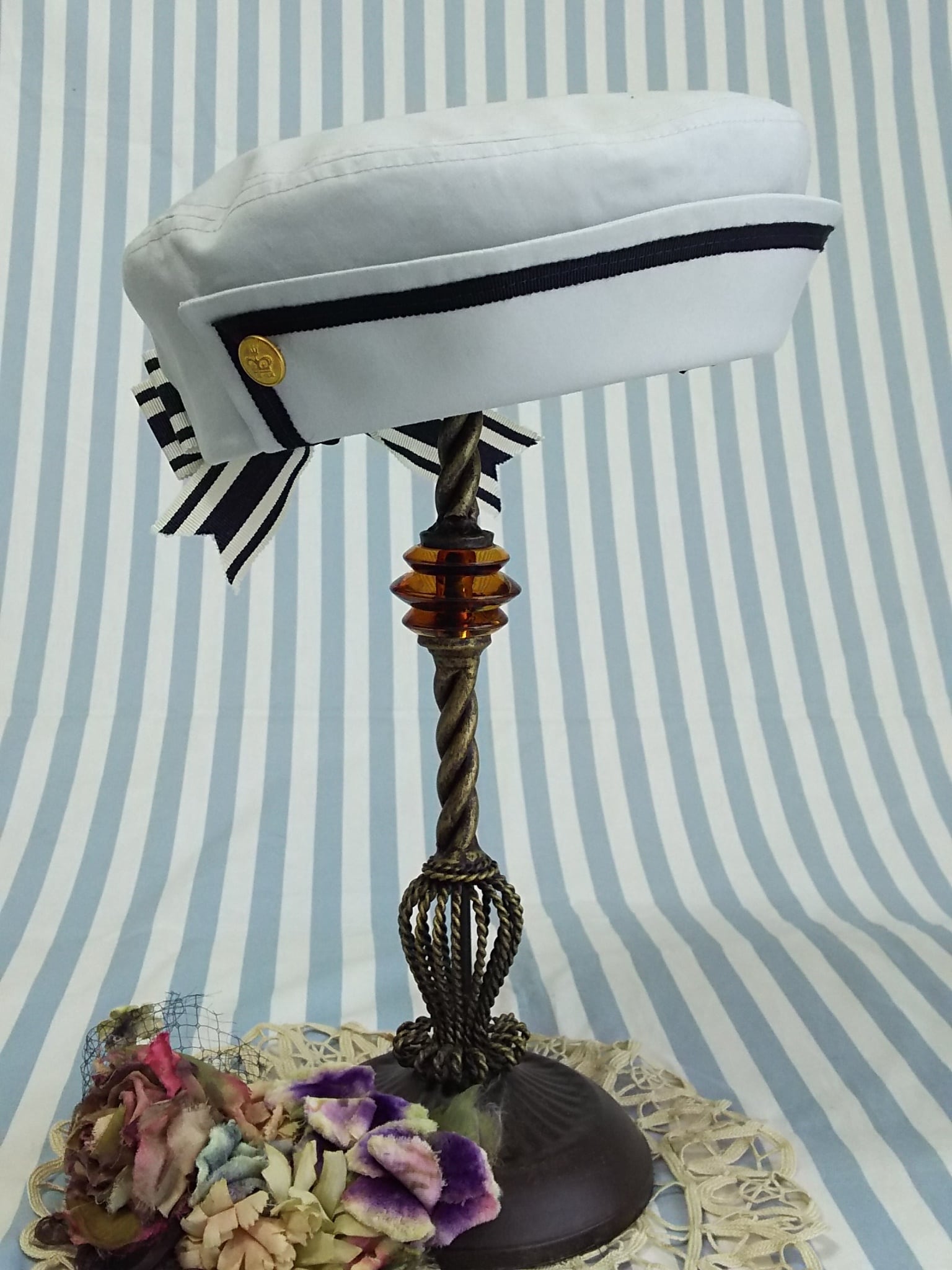 ヴィンテージの金ボタンがアクセントになった爽やかなセーラーベレー帽です。普通のベレー帽のように斜めにかぶったり、後ろ倒しにかぶったり、お似合いの角度をお試しくださいね。