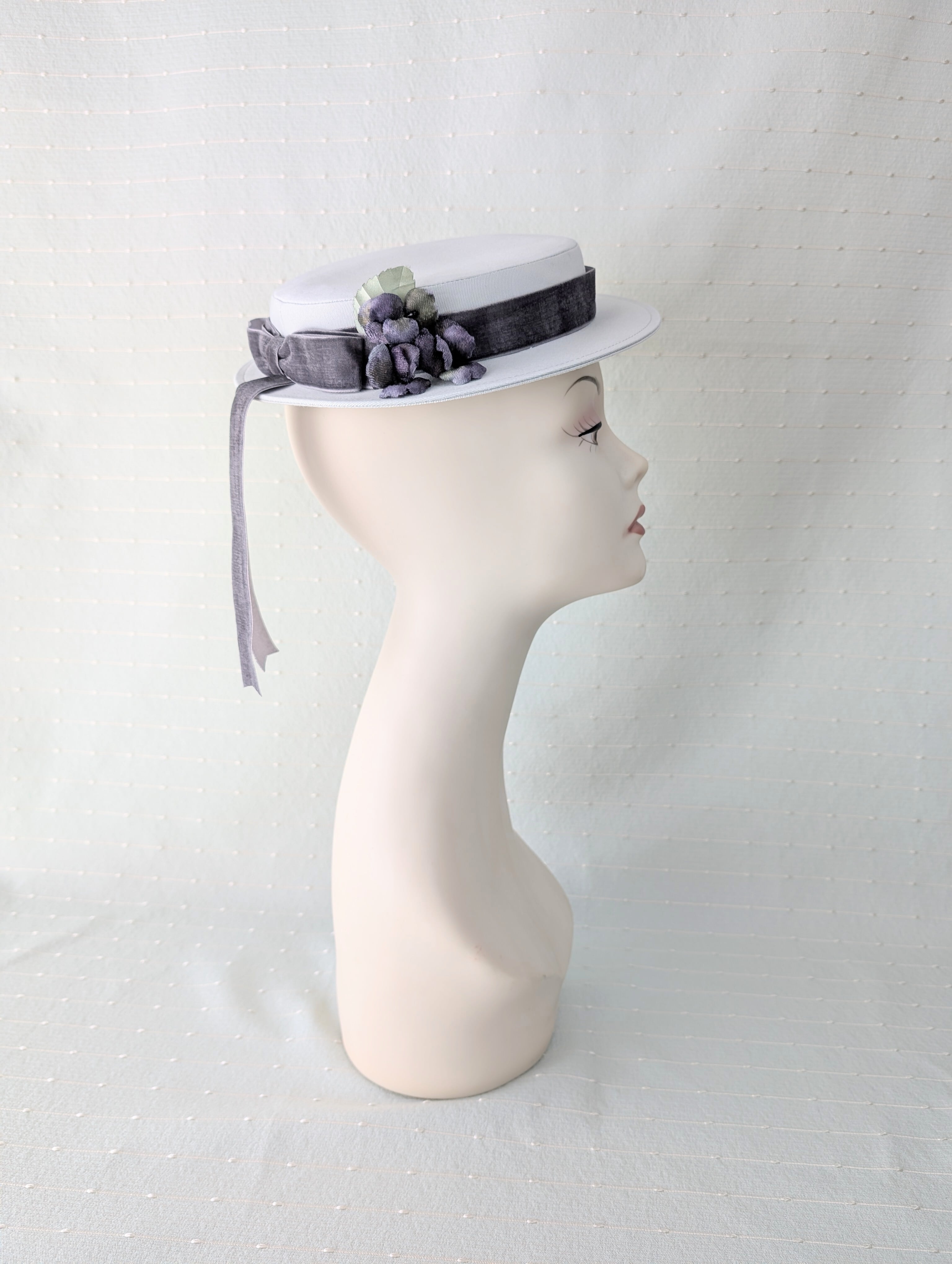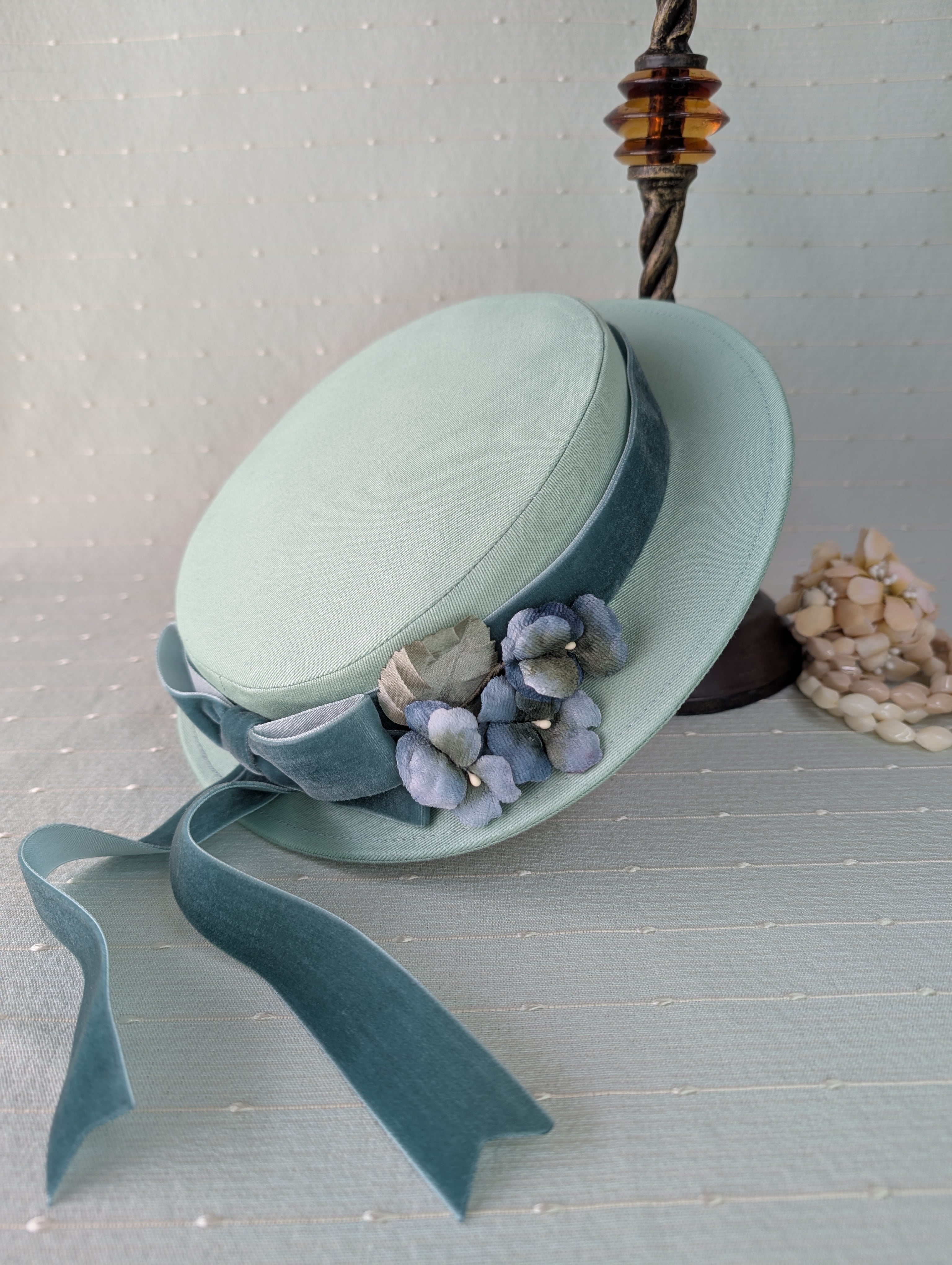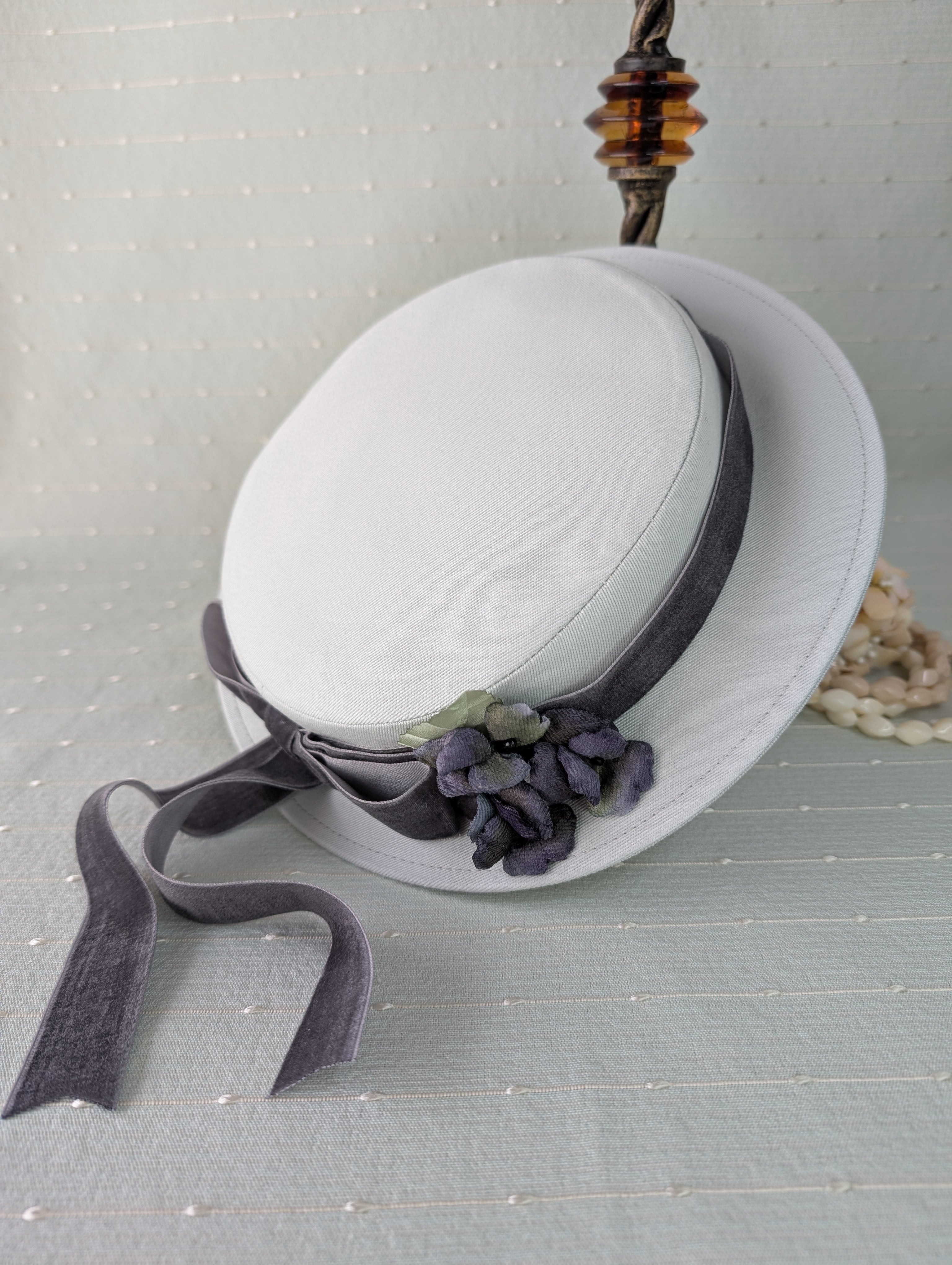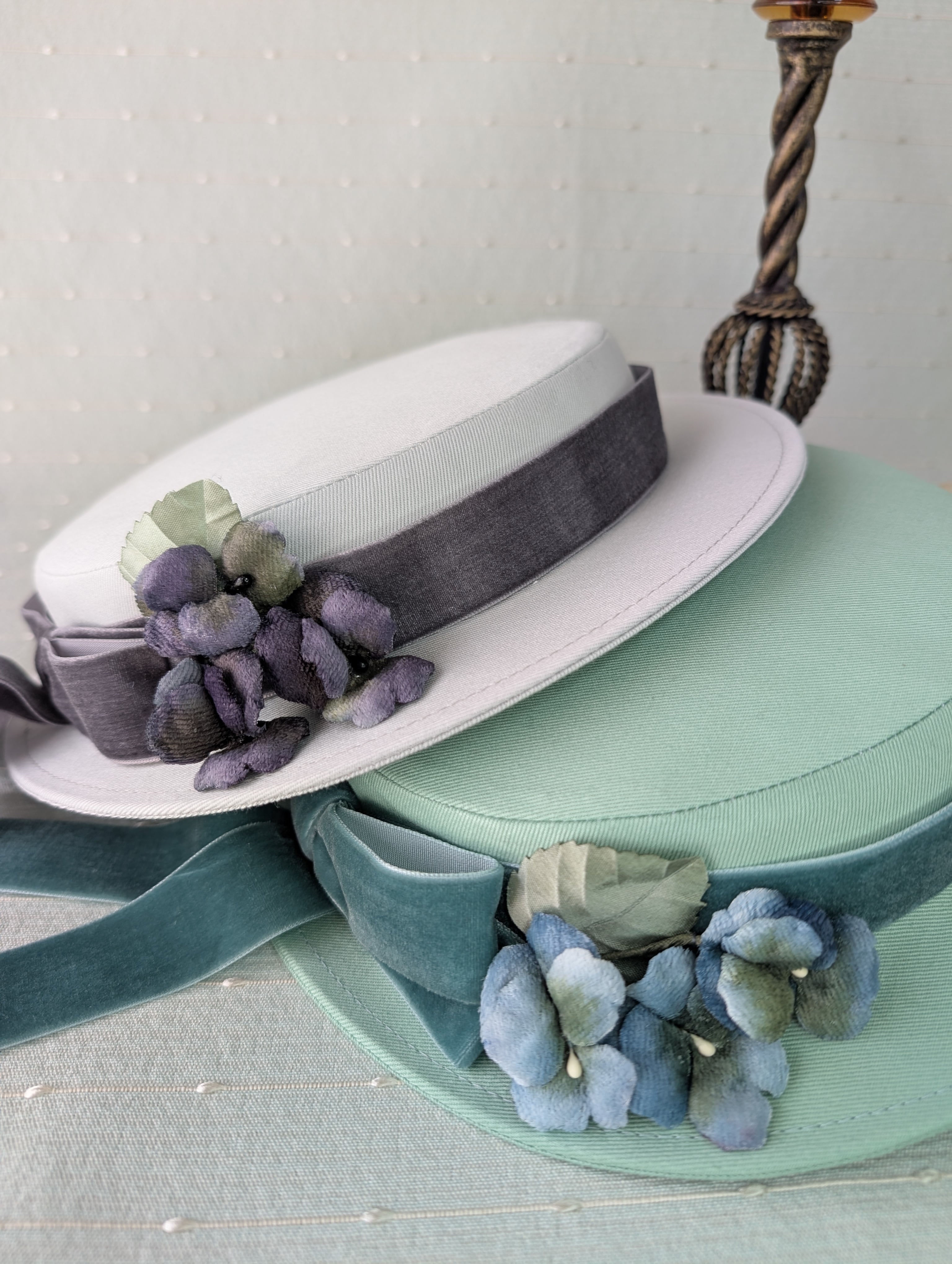 ベルベットリボンとビオラを飾ったパステルカラーのミニカンカンです。長く垂れるリボンがひらひらと揺れてロマンチック。