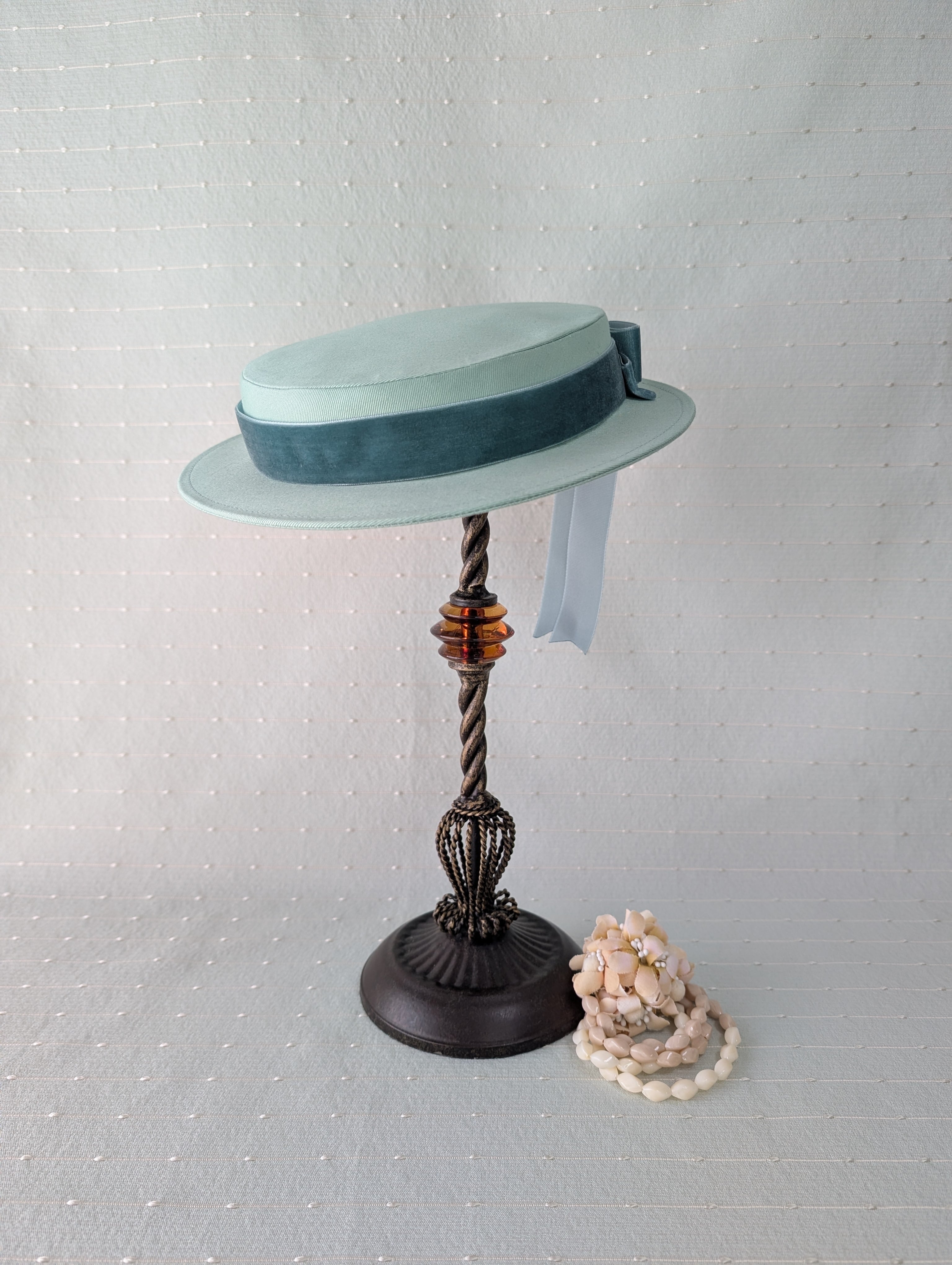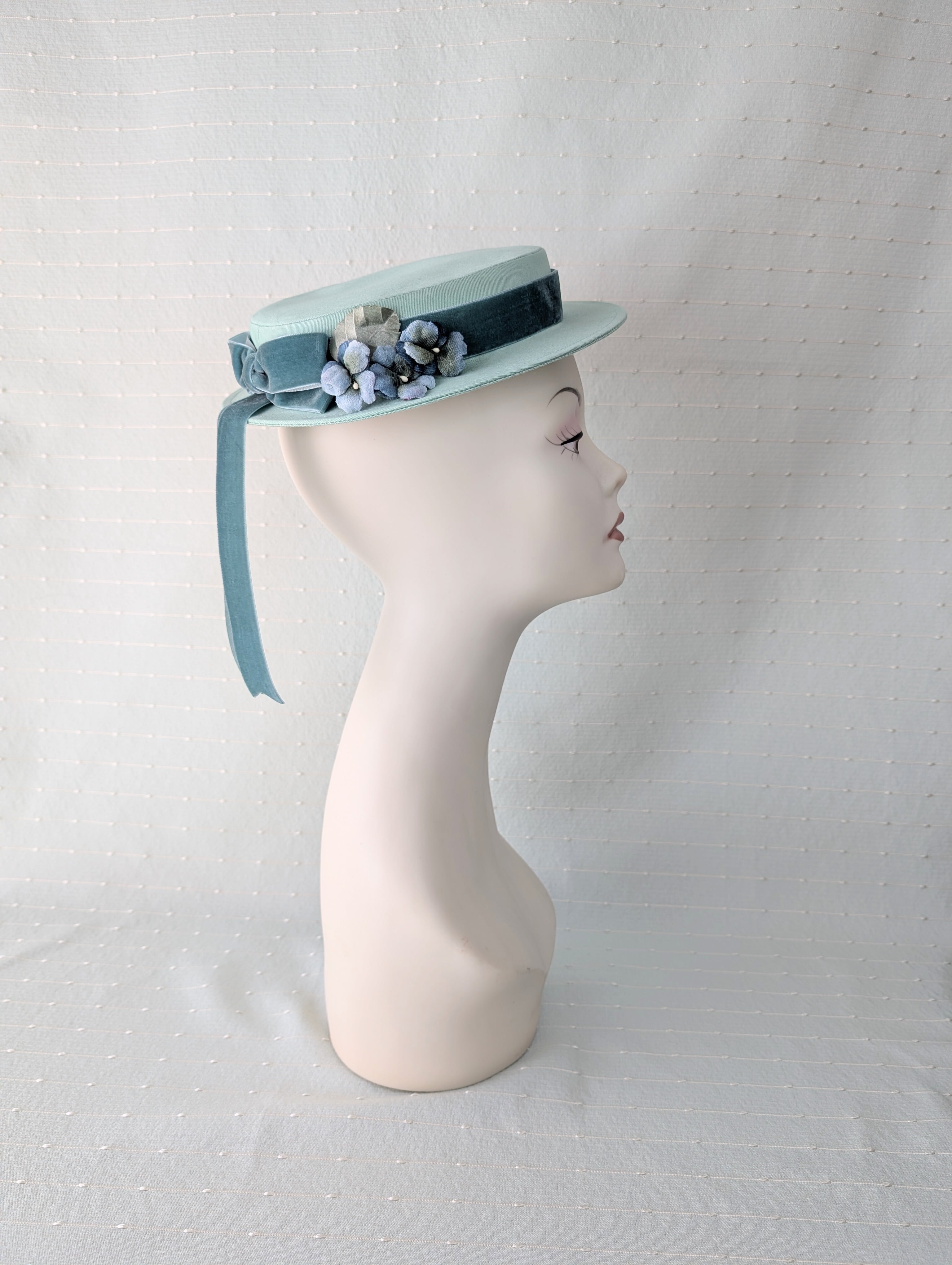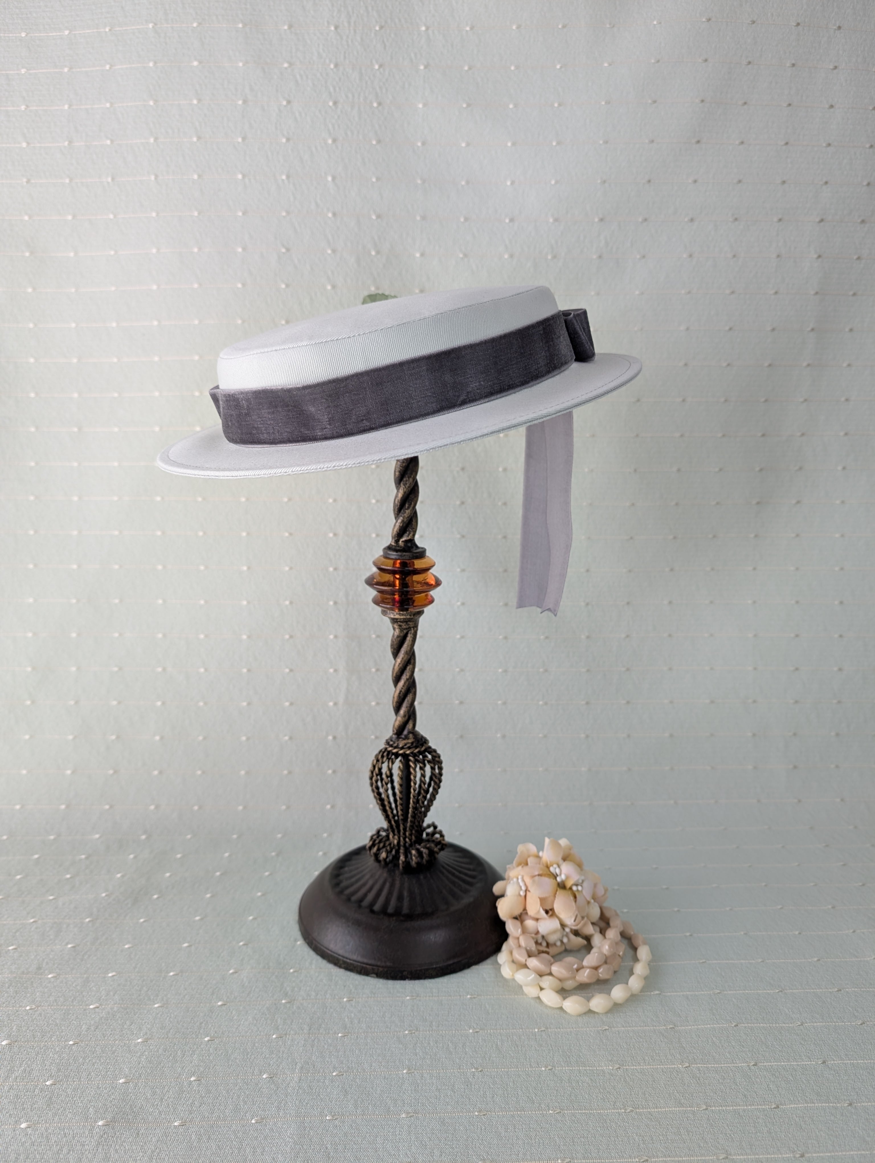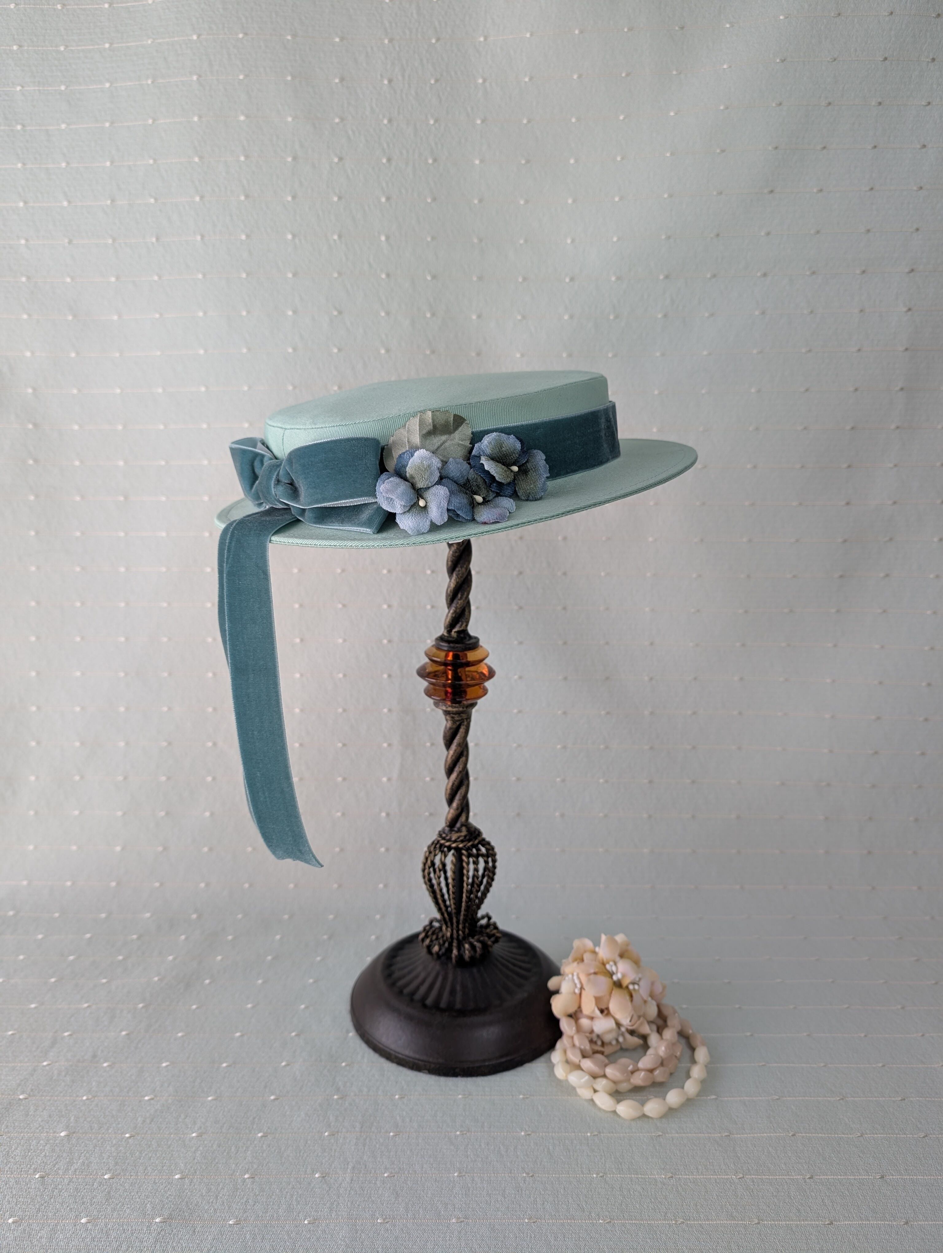 ベルベットリボンとビオラを飾ったパステルカラーのミニカンカンです。長く垂れるリボンがひらひらと揺れてロマンチック。