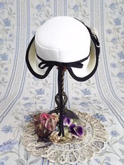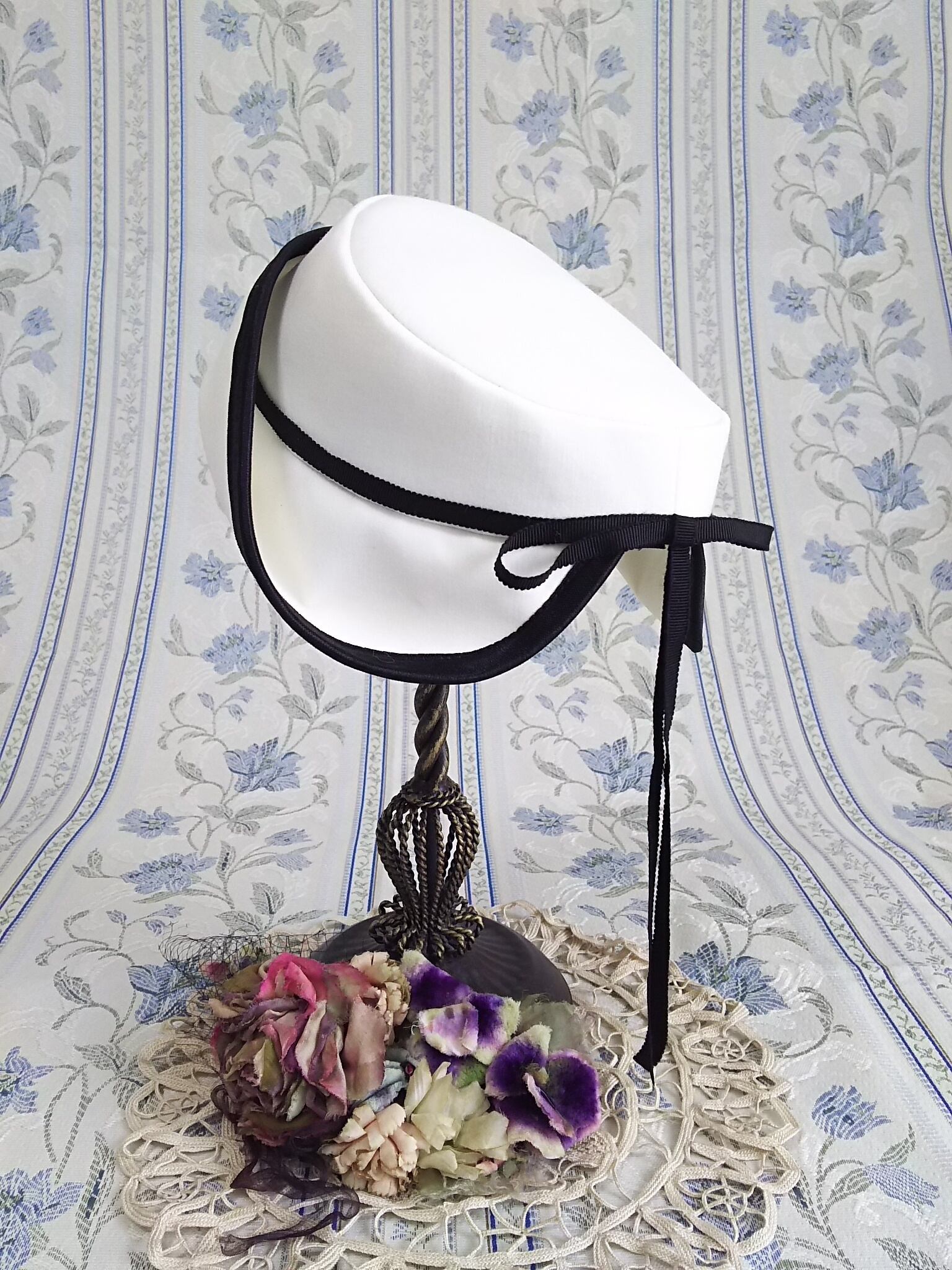 ブリムを折り返し、グログランリボンにカメリアを飾った帽子です。ひたいにかからないよう、バックを低く作っているので、とてもかぶりやすいです。かぶると大きめのリボンに丸いフォルムでとても可愛らしい印象。