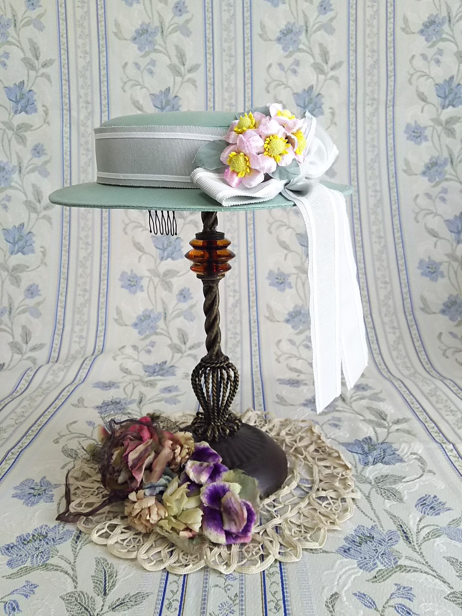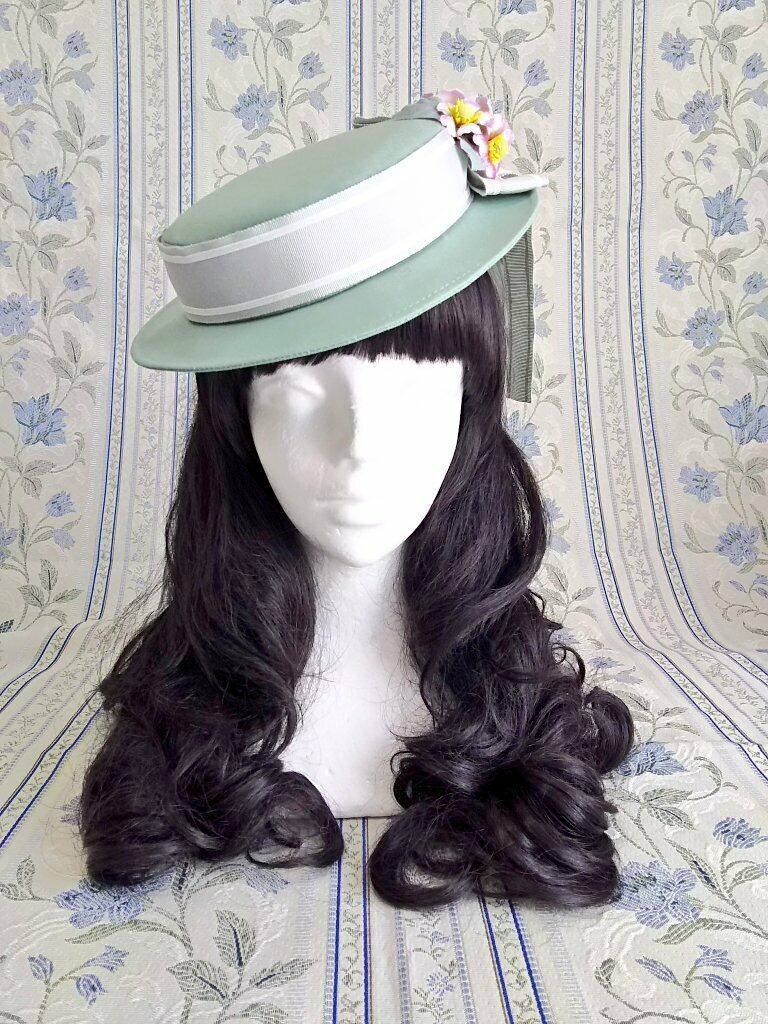 ヴィンテージハットにインスパイアされて作った小さなカンカン帽型の帽子。斜め後ろにひらひらと垂れるリボンとピンクの花束を飾った甘い印象の帽子です。