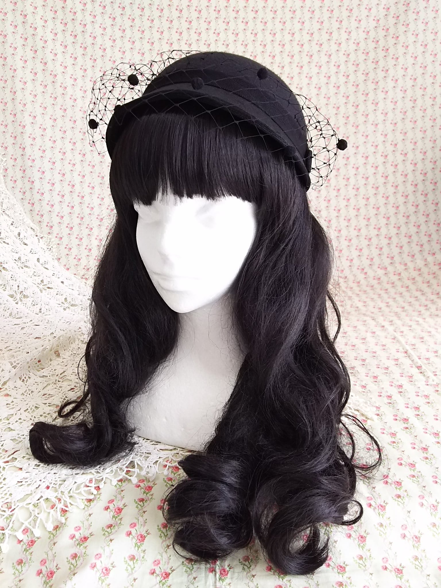 コロンとした形が可愛いミニハットです。大き目のモールが付いたヴェールがレトロポップな雰囲気。あまり目立ちすぎず、お洋服、お着物に合わせやすいのではないかと思います。