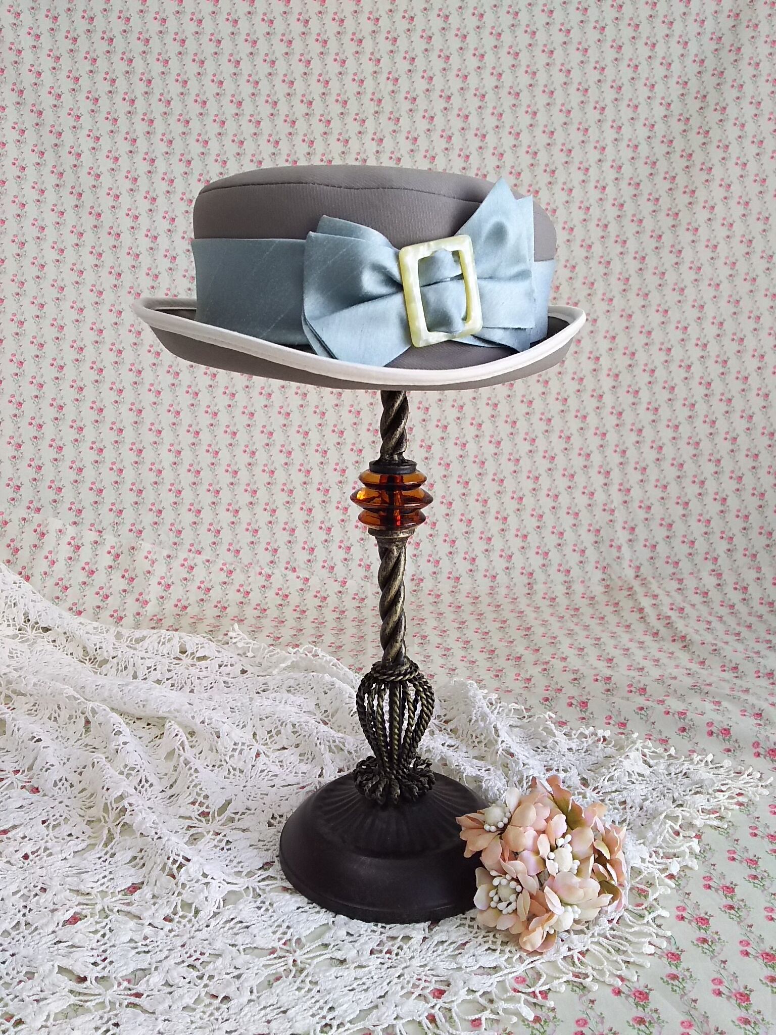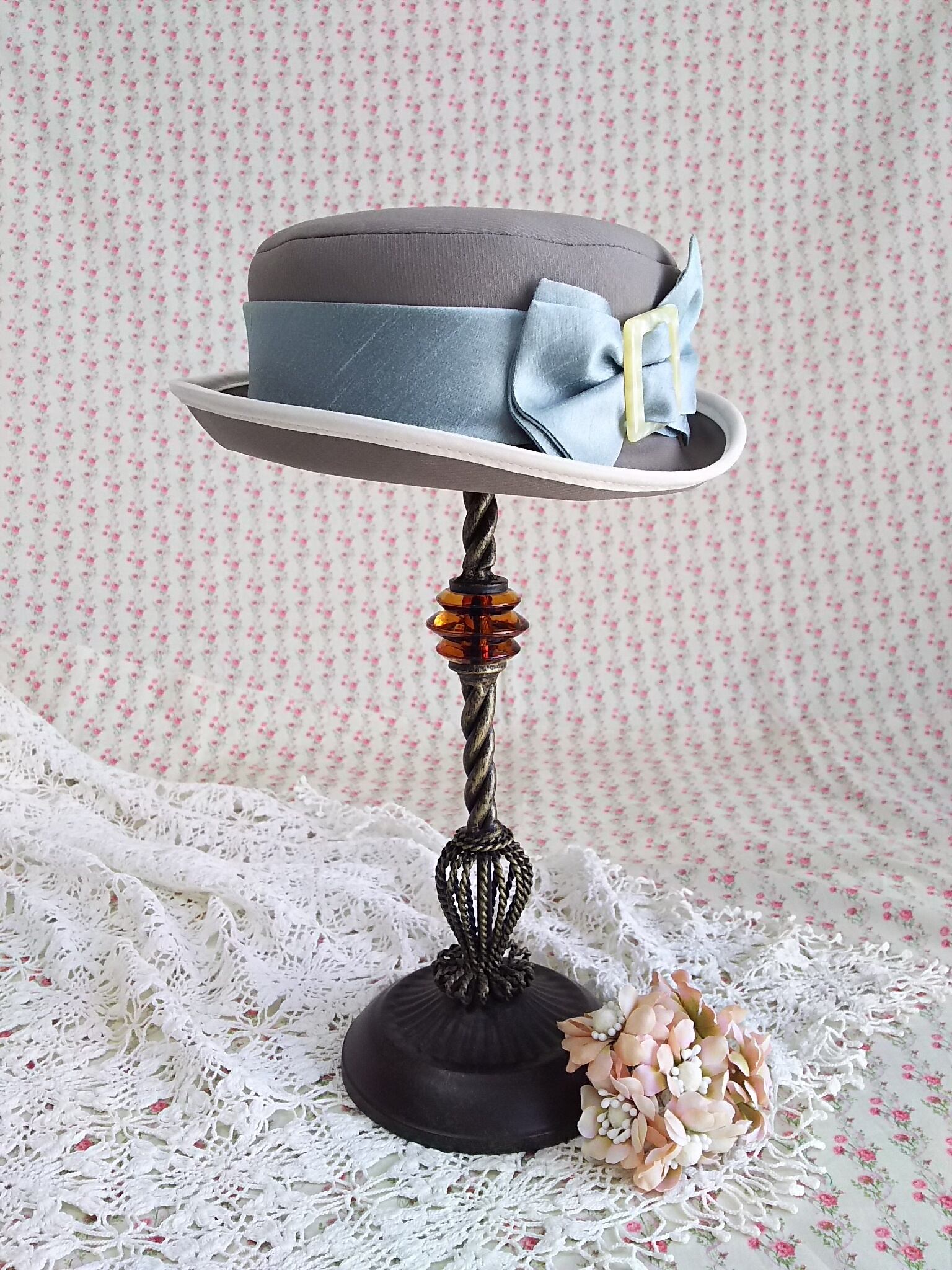 マニッシュなシルクハット型の帽子を女性がかぶっても可愛いサイズ感に仕上げました。カフェオレ色にガーリーなミントグリーンのシャンタンリボン。ガーリートラッドな雰囲気です。