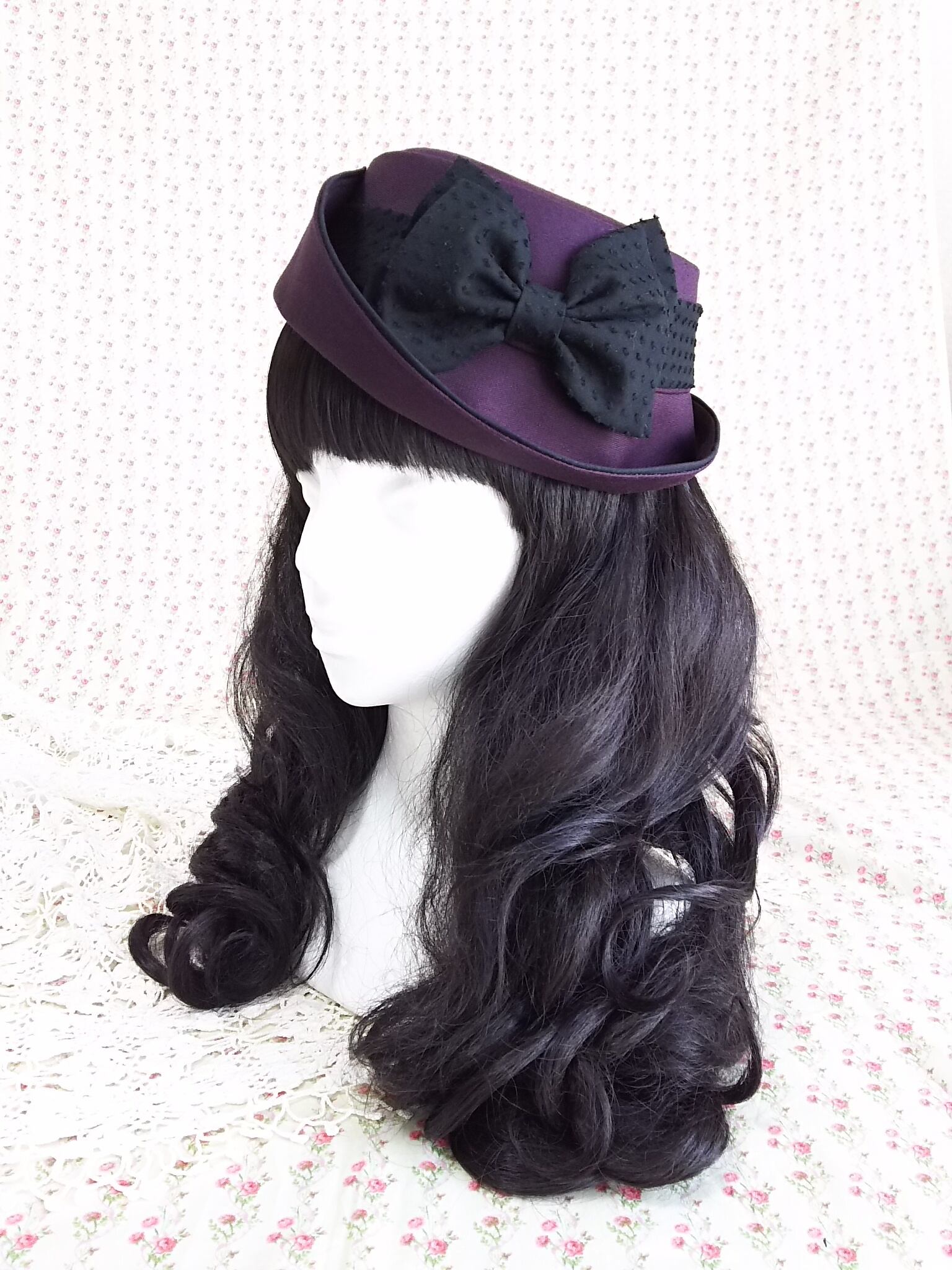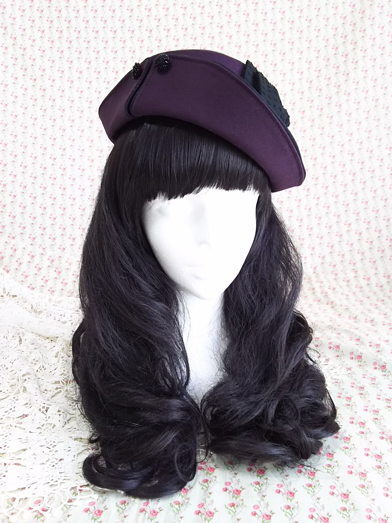 クロシェ型の帽子のブリムを折り返し、ボタンで飾った個性的な形の帽子です。見る方向によって表情が違って、モードな雰囲気です。コーディネートのスタイリッシュな仕上げにいかがでしょうか。