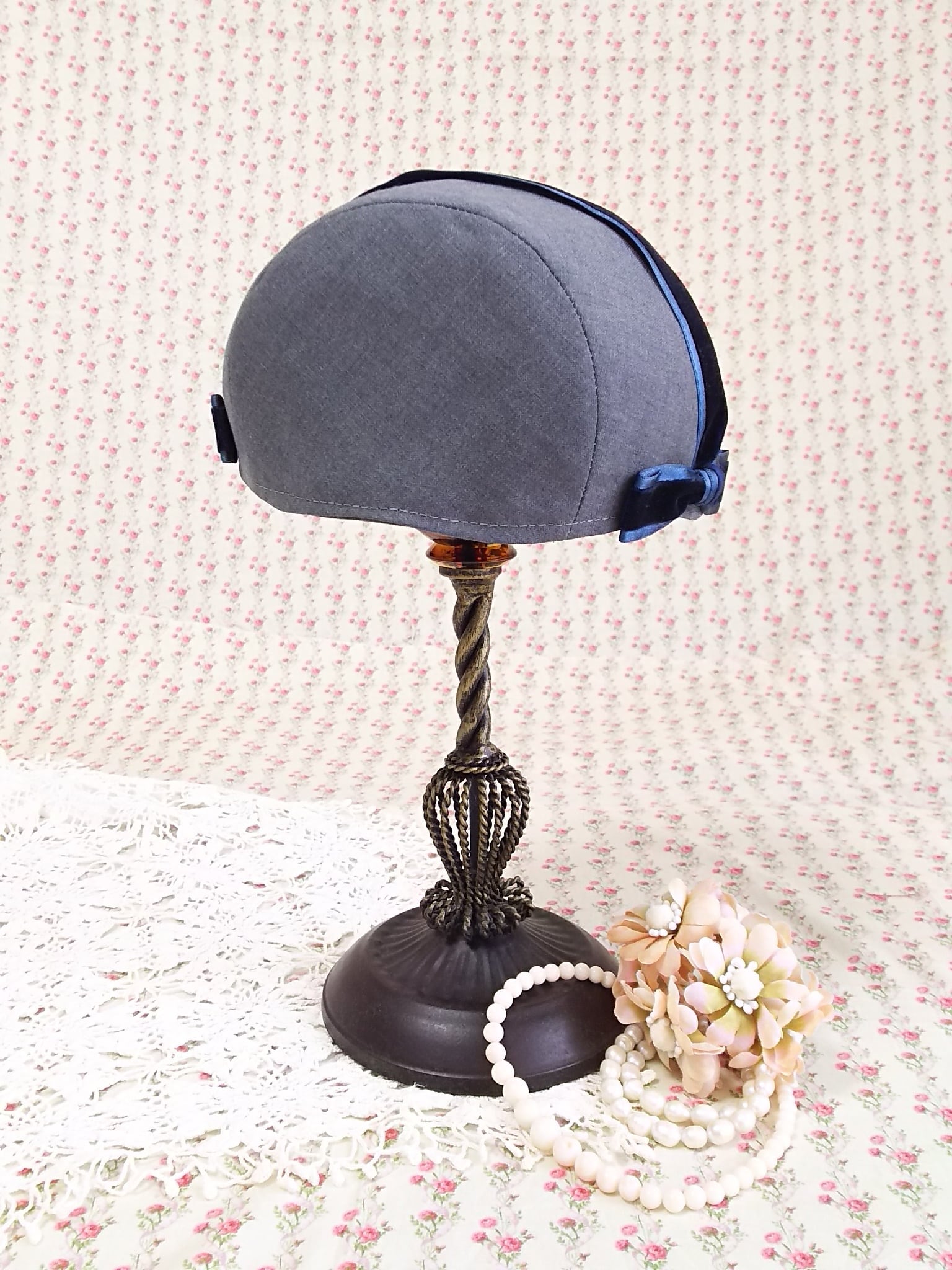 コロンとしたすずらんの花のかたちのような帽子です。グレーのサマーウール生地で作りました。控えめな可愛らしさで、お洋服にも合わせやすいのではないかと思います。リボンはネイビーのベルベット。両サイドにコーム付き。