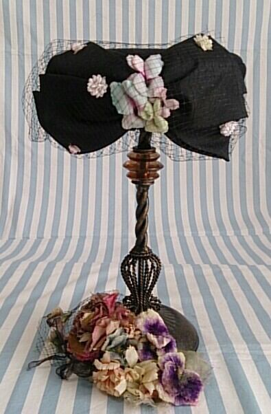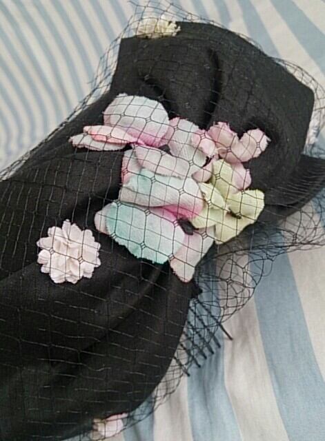 黒のコットン生地に、上品な黒のシャンタンのリボンを飾りました。一枚一枚丁寧に染められた愛らしい菫やカスミ草を散らし、ネットをかぶせて、50年代風に仕上げました。フォーマルにもお使いいただけると思います。