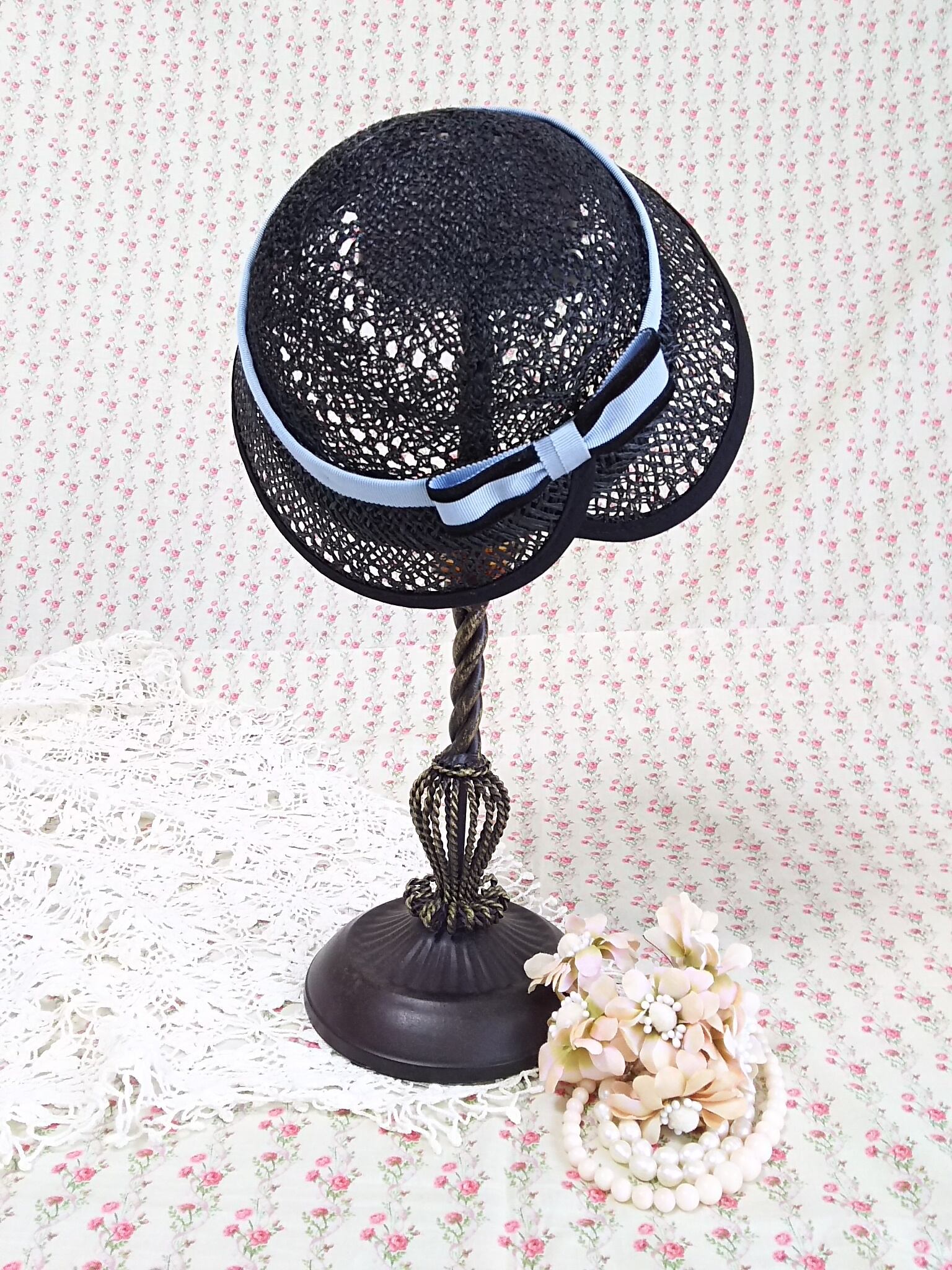 透かし編みの天然草帽体を型入れして作りました。クラウンに対してブリムをアシンメトリーに付けたちょっと変わった作りになっています。スカルキャップに近い小さな帽子で真っ直ぐかぶっても、横の方に付けても、または後頭部側に大きく倒しても、お好きな位置に付けて下さいね。頭のサイズが小さめでお悩みの方にぜひオススメの帽子です。