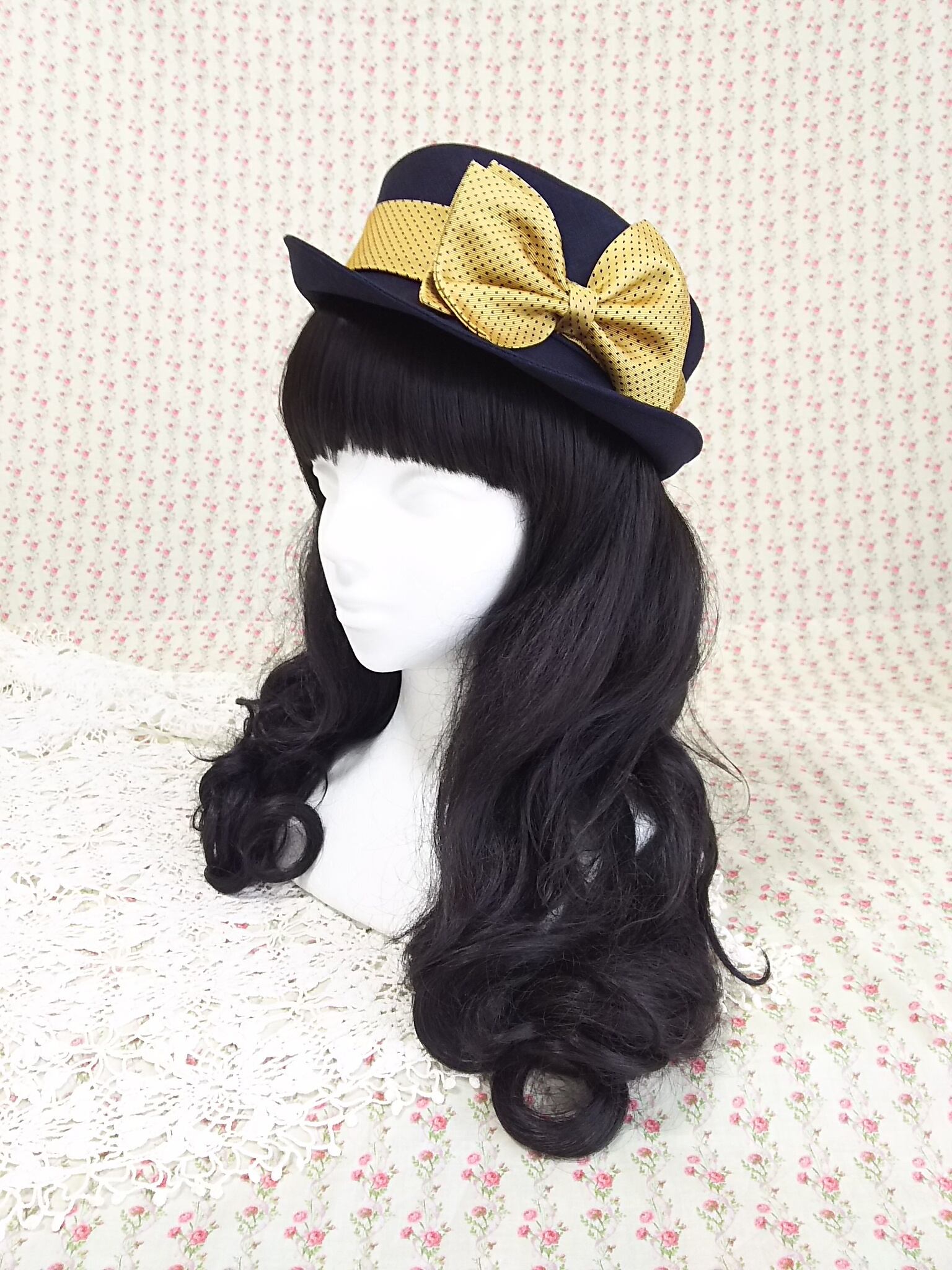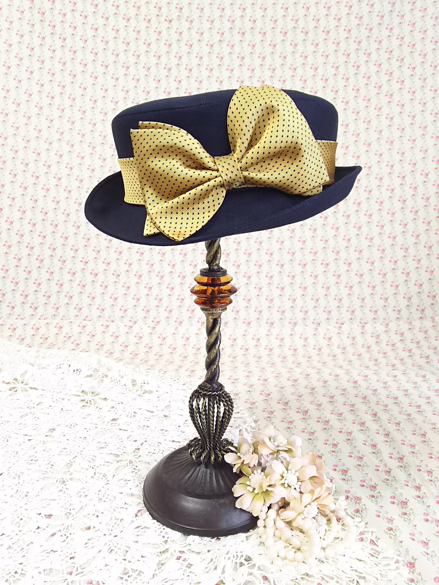 本体:ネイビー リボン:紺ドットの黄色(光沢のあるシルクジャガード)
