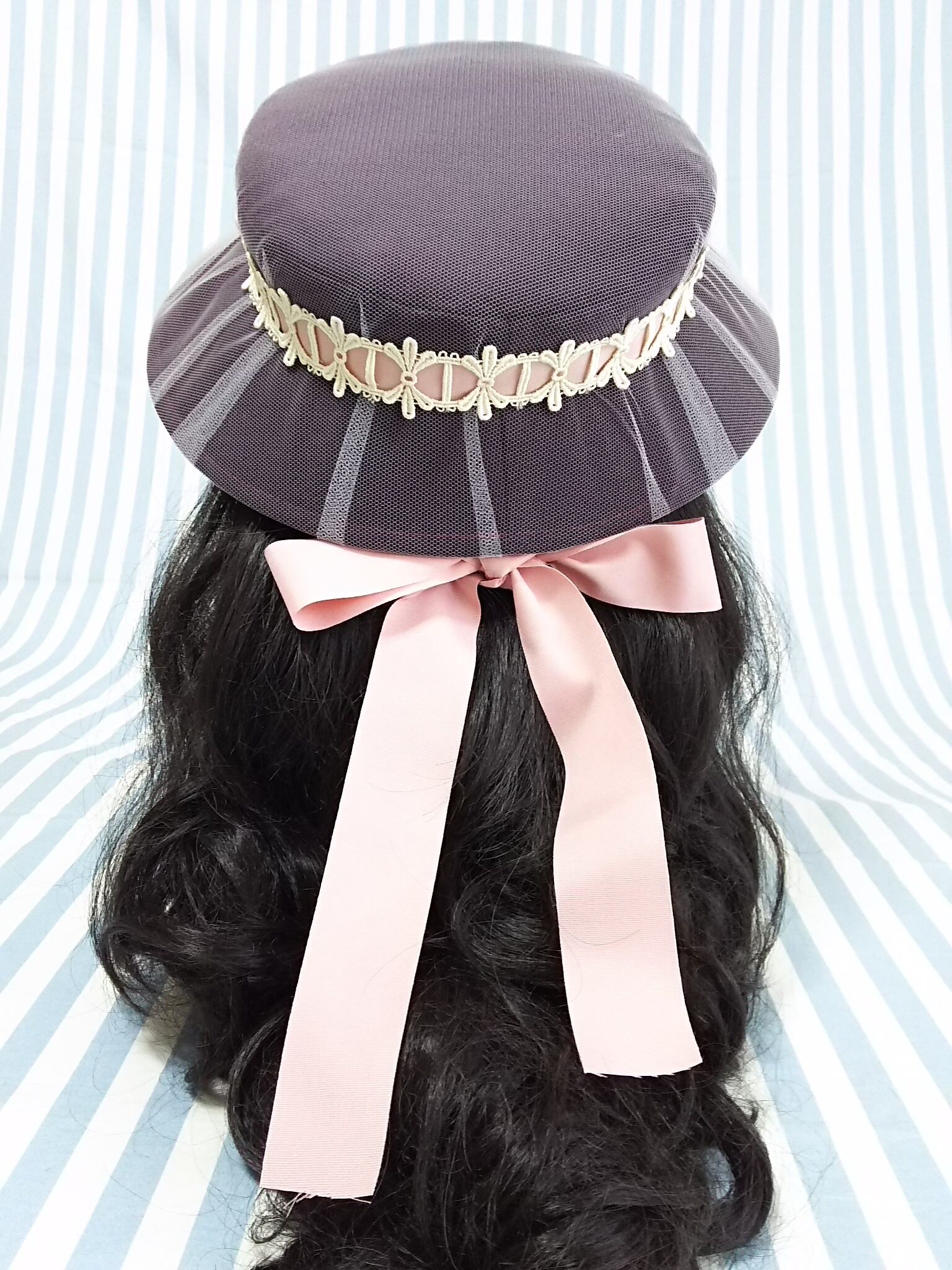 あずき色のコットン生地の帽子にチュールをかぶせ、ピンクのコットングログランリボン、紅茶染めした梯子レース、小さなアンティークチェコガラスボタンを飾りました。