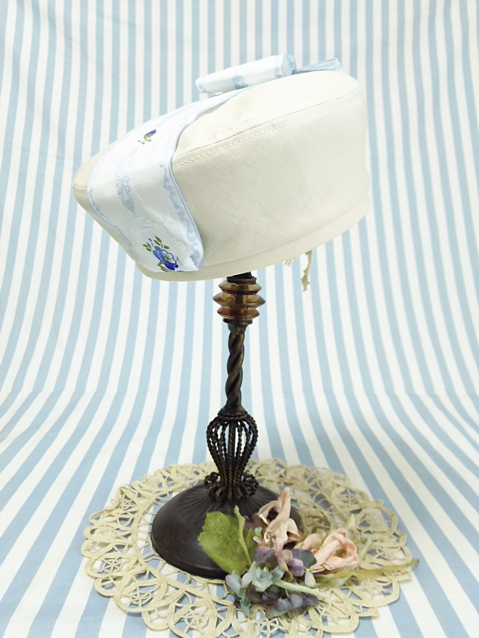 アイボリーの麻生地に、デッドストックのフランスヴィンテージリボン、布花作家Pauline Roseさんに作っていただいたグレーの菫を飾りました。さわやかで清楚な雰囲気のベレー帽です。