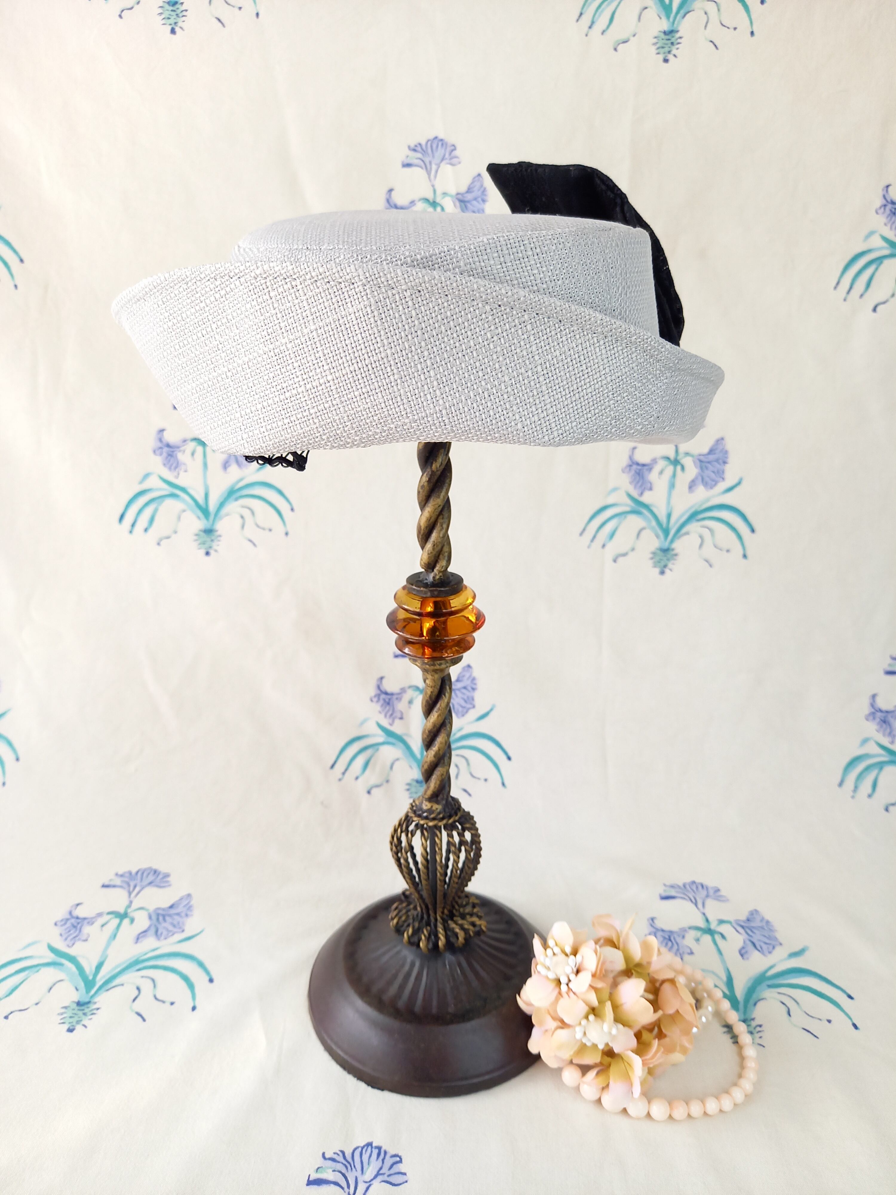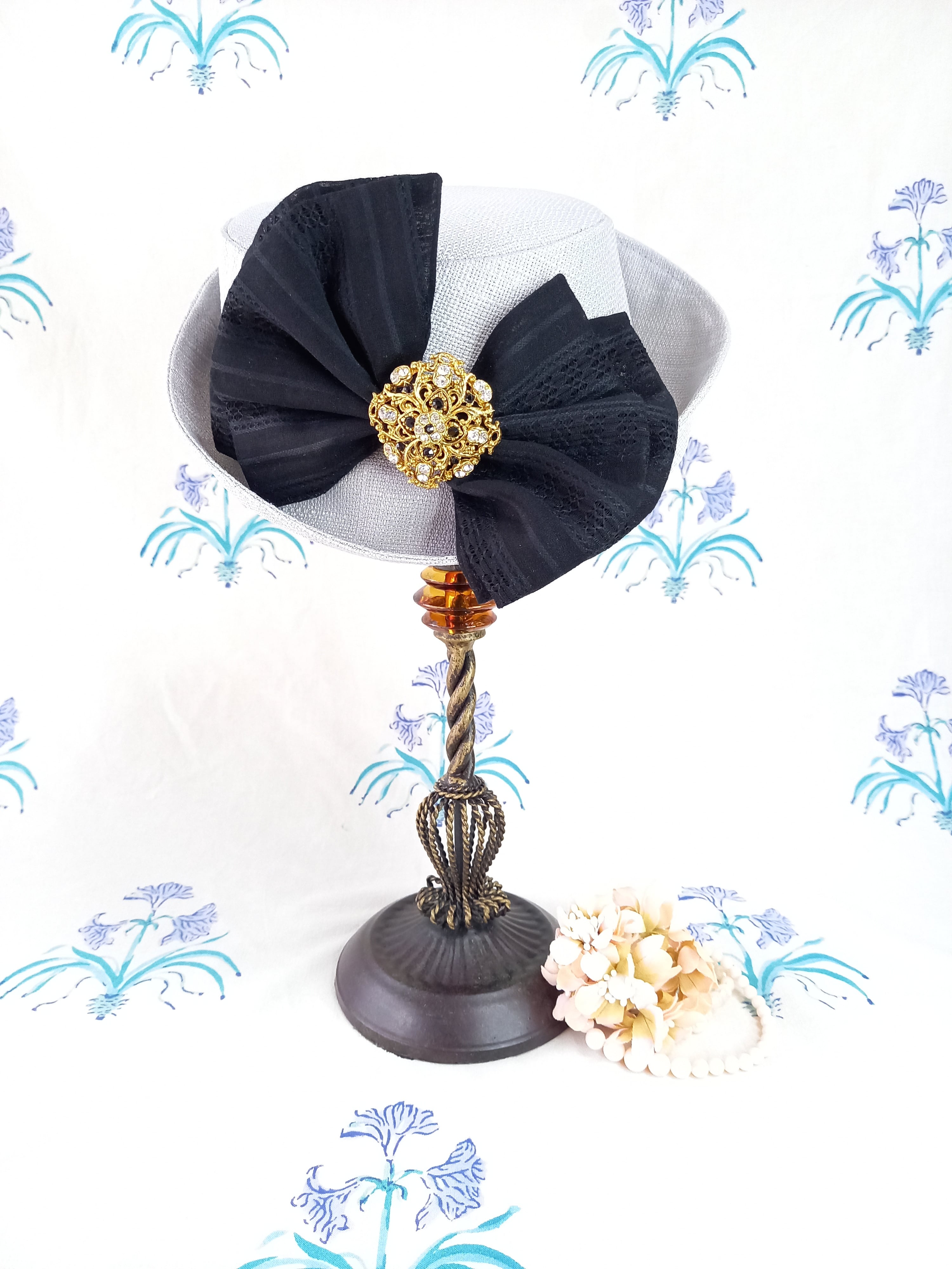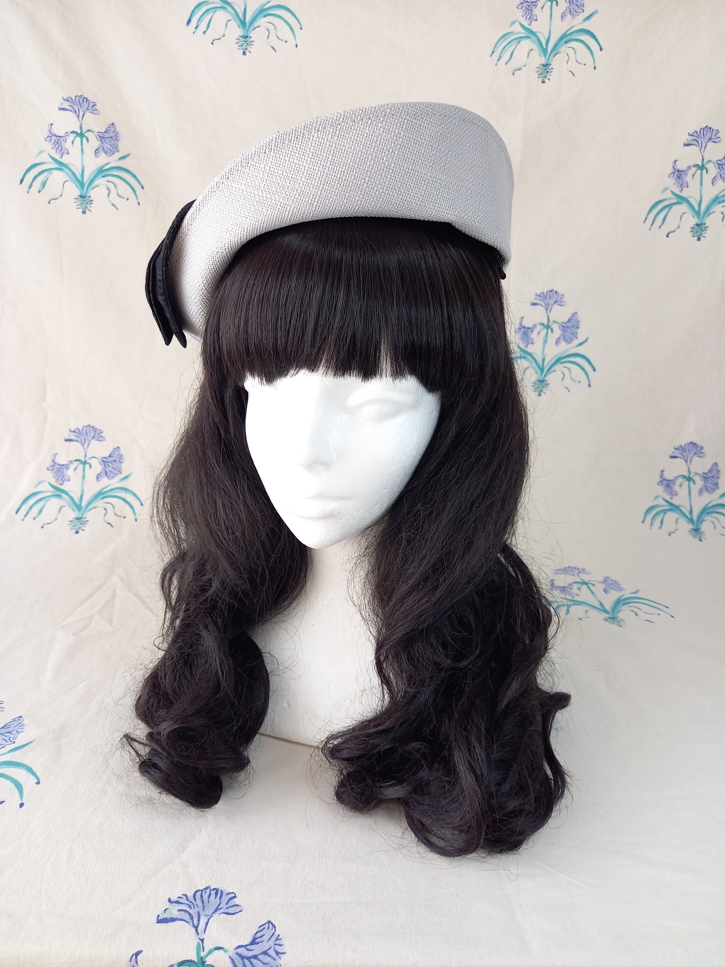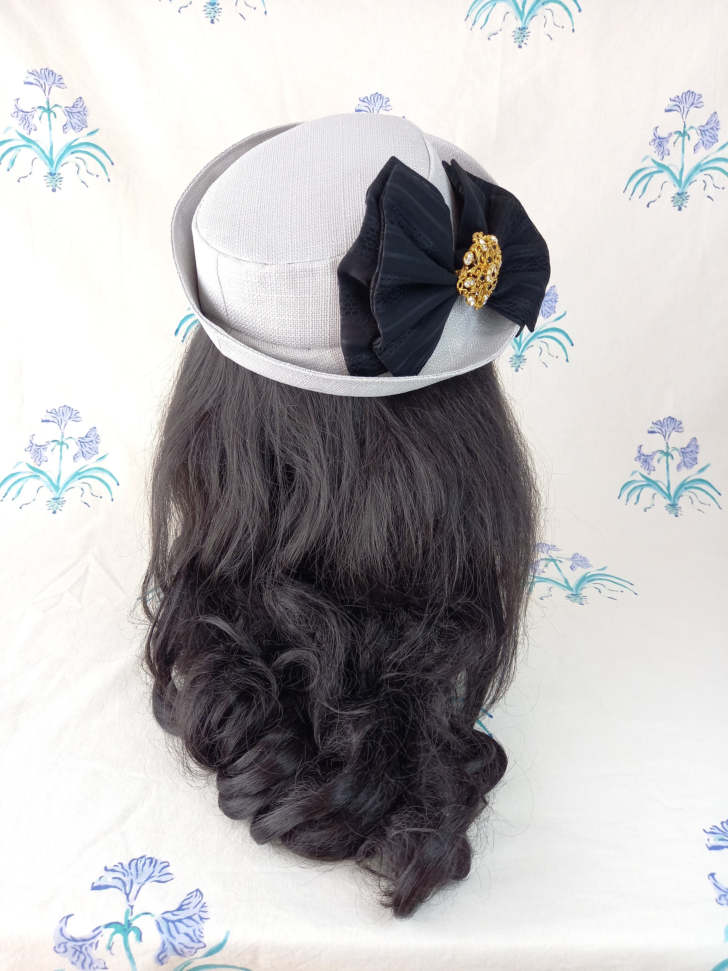 ヴィクトリアンスタイルの帽子にインスパイヤされて作った帽子です。クラウンは浅いので、内側のコームで髪に固定してかぶってください。本体は白に近いグレー。リボンは黒の綿レースです。リボンに飾ったブローチは取り外しできるので、お好きなものと取り換えることもできます。まっすぐかぶるだけでスタイルが決る、とてもかぶりやすい帽子です。