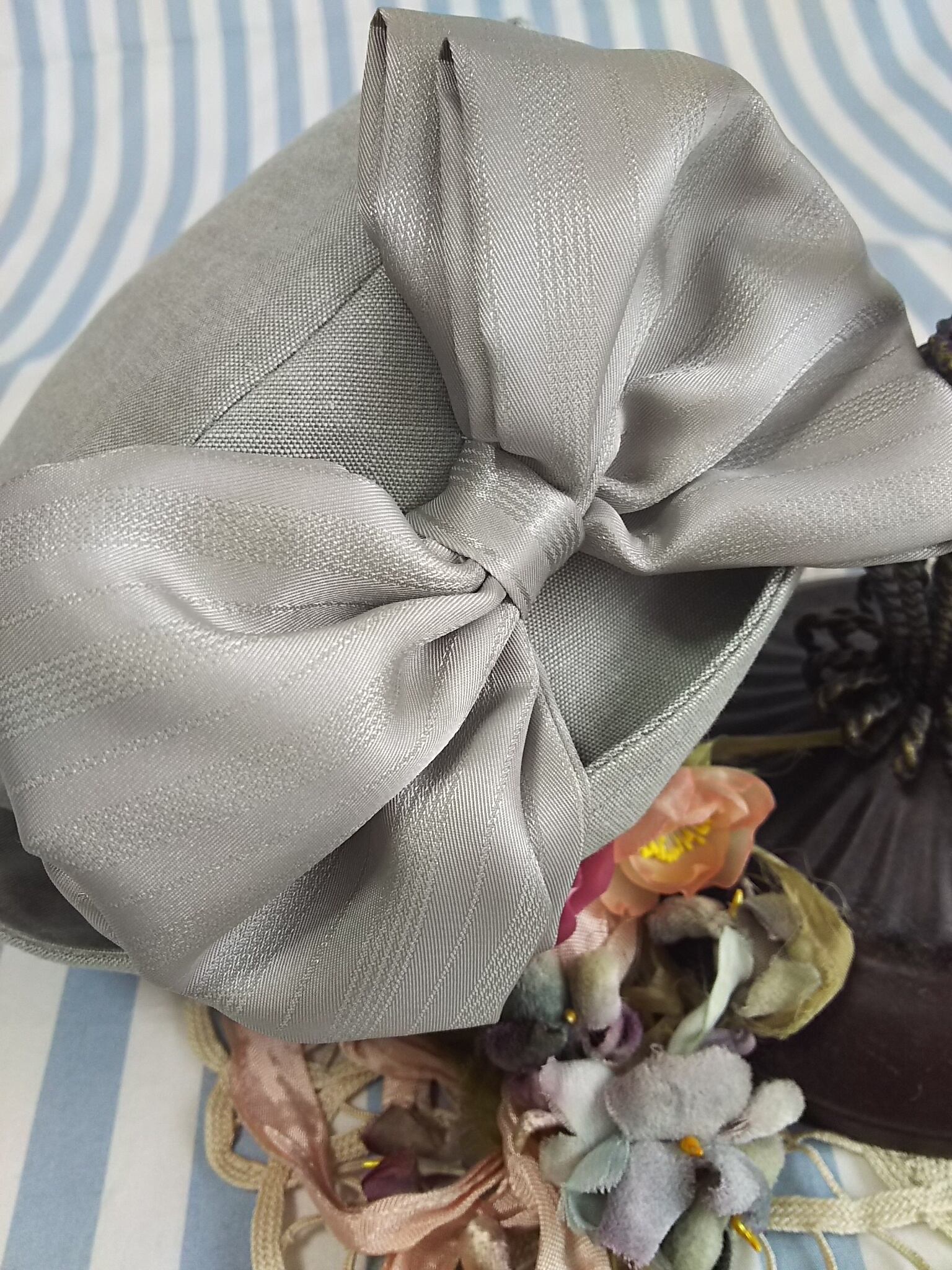 薄いカーキグリーンの生地にライトグレーのストライプリボンを飾りました。