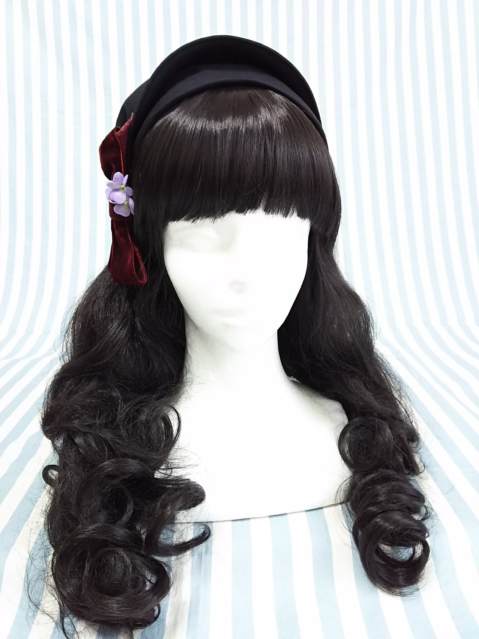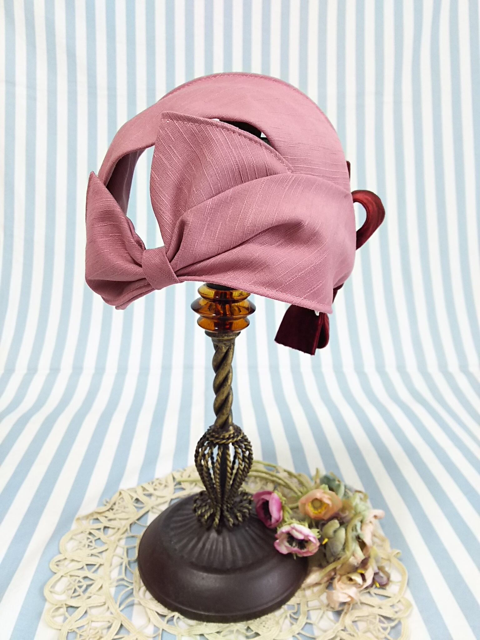 ターバンのようなカチューシャです。エッジにワイヤーを入れた布をぐるりと巻いています。サイドにはエンジ色のベルベットリボンに紫色のスミレを飾りました。バックもリボンの形にしており、後ろ姿も可愛いですよ。
