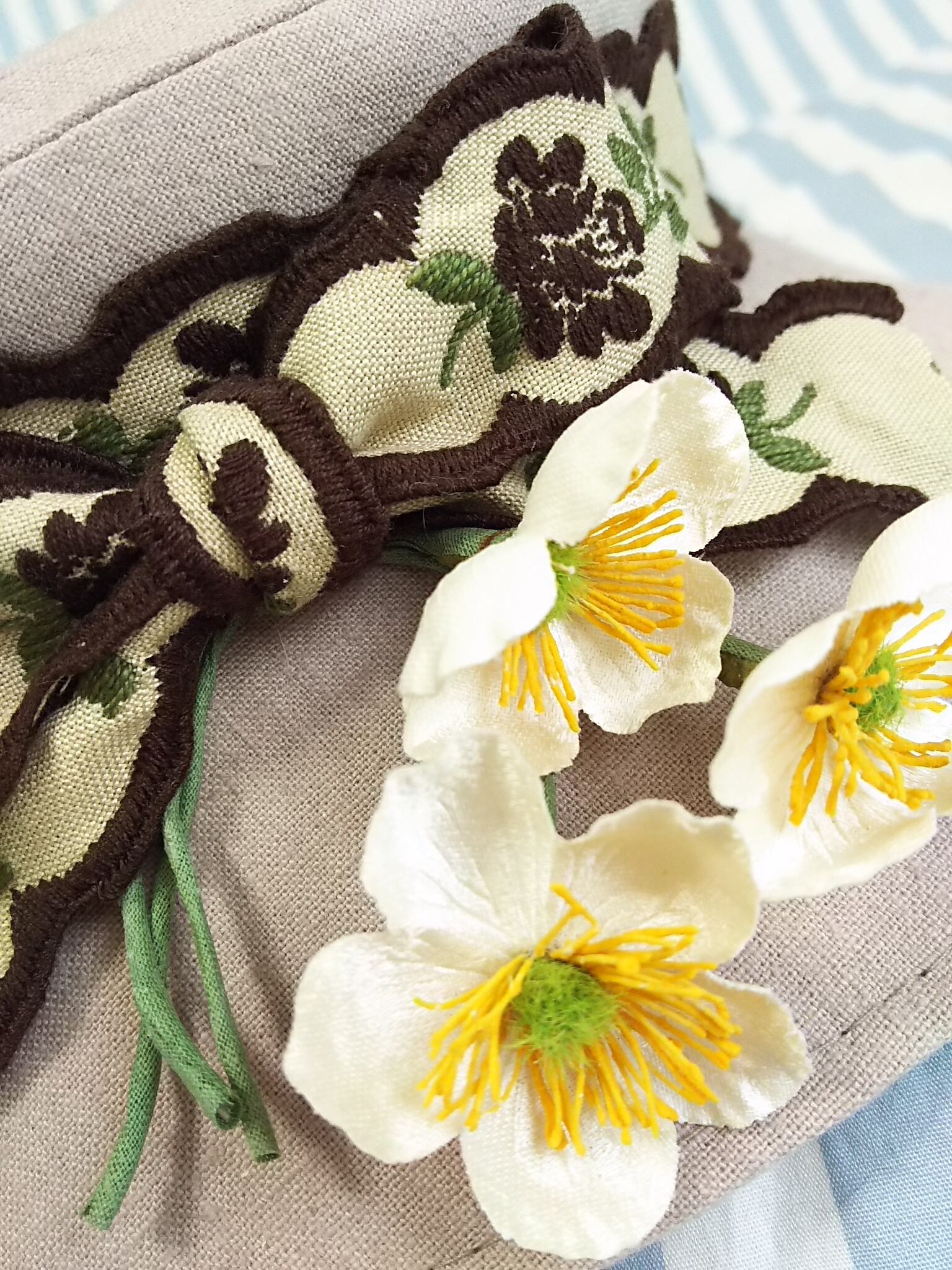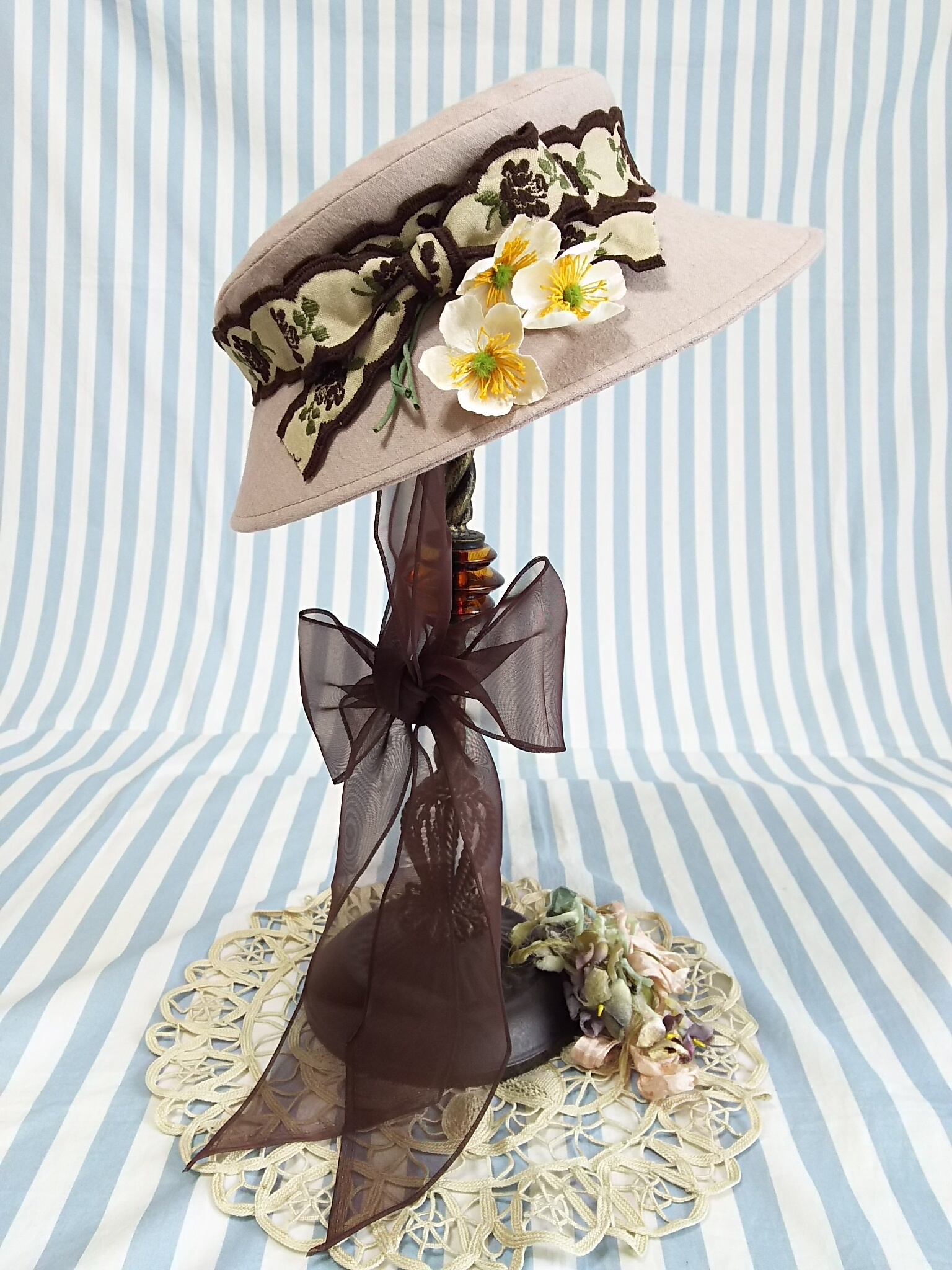 アンティークな風合いのピンクベージュの生地に、ヴィンテージのお花刺繍リボン、ヴィンテージの白い布花を飾りました。シフォンのあごリボンをふんわり結んでかぶってくださいね。